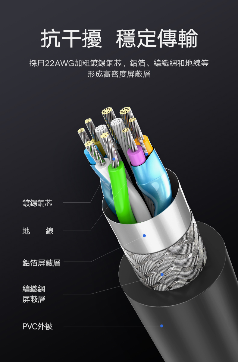 ◆採用22AWG加粗鍍錫銅芯 傳輸穩定抗干擾
