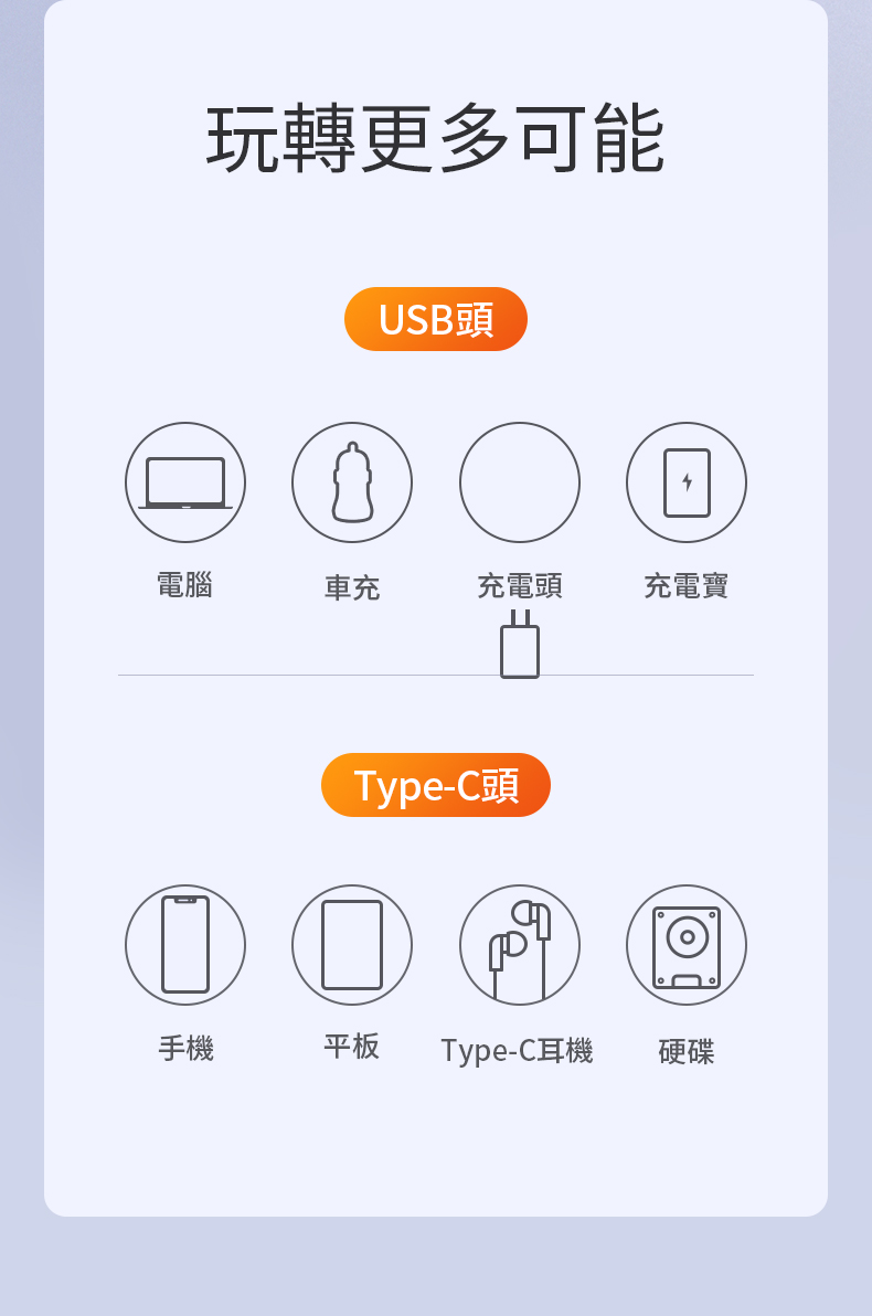 ◆數據高速傳輸 共享精彩 ◆Type-C耳機輕鬆轉接 輸出震撼 ◆智慧電阻 無損設備安心充電 ◆USB車充轉接雙Type-C傳輸線 ◆自帶掛繩 無懼丟失