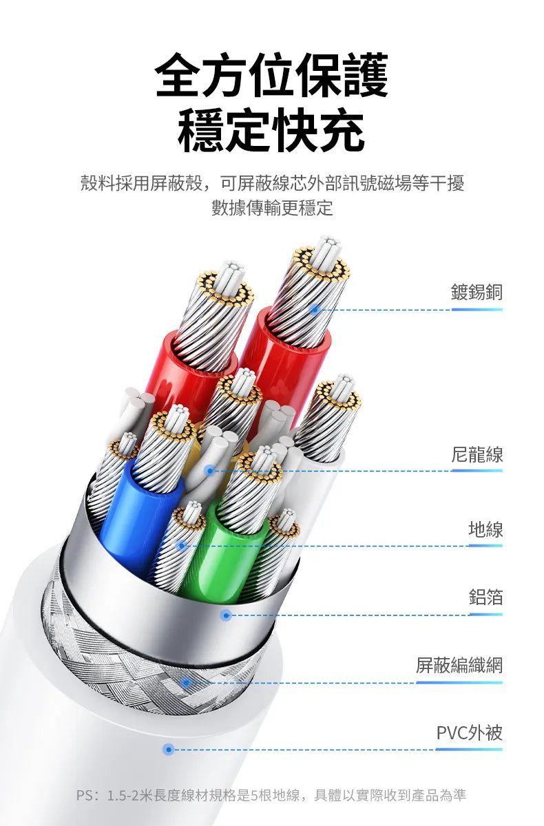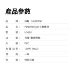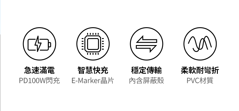 急速滿電 PD100W閃充,E-Marker晶片 智慧快充,穩定傳輸 內含屏蔽殼,PVC材質 柔軟耐彎折