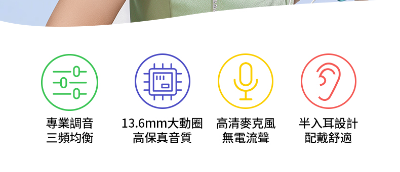 ◆專業調音 三頻均衡 ◆13.6mm大動圈 高保真音質 ◆高清麥克風 無電流聲 ◆半入耳設計 配戴舒適 ◆大師級專業調音 呈現好聲音 ◆舒適貼耳 輕盈無感
