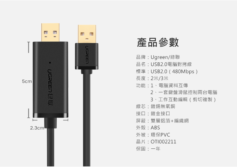 綠聯 2M USB複製線 電腦數據互傳共享鍵盤滑鼠