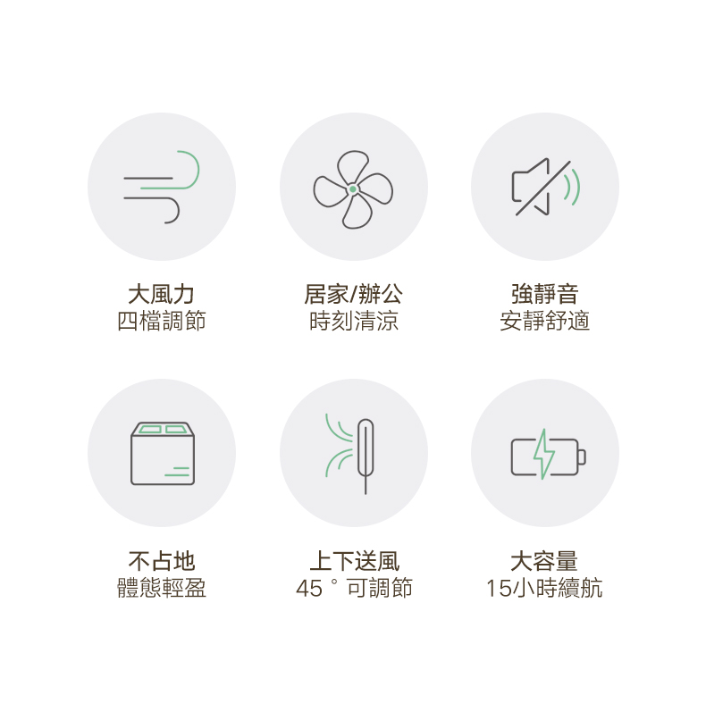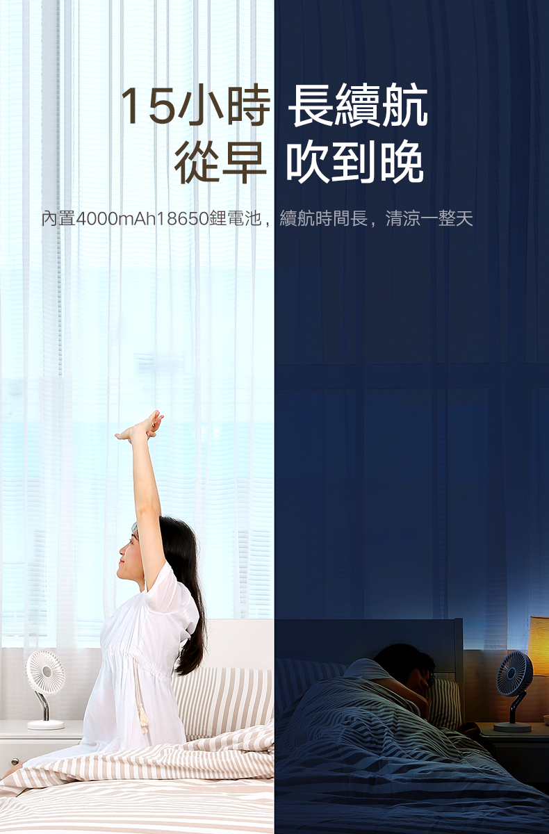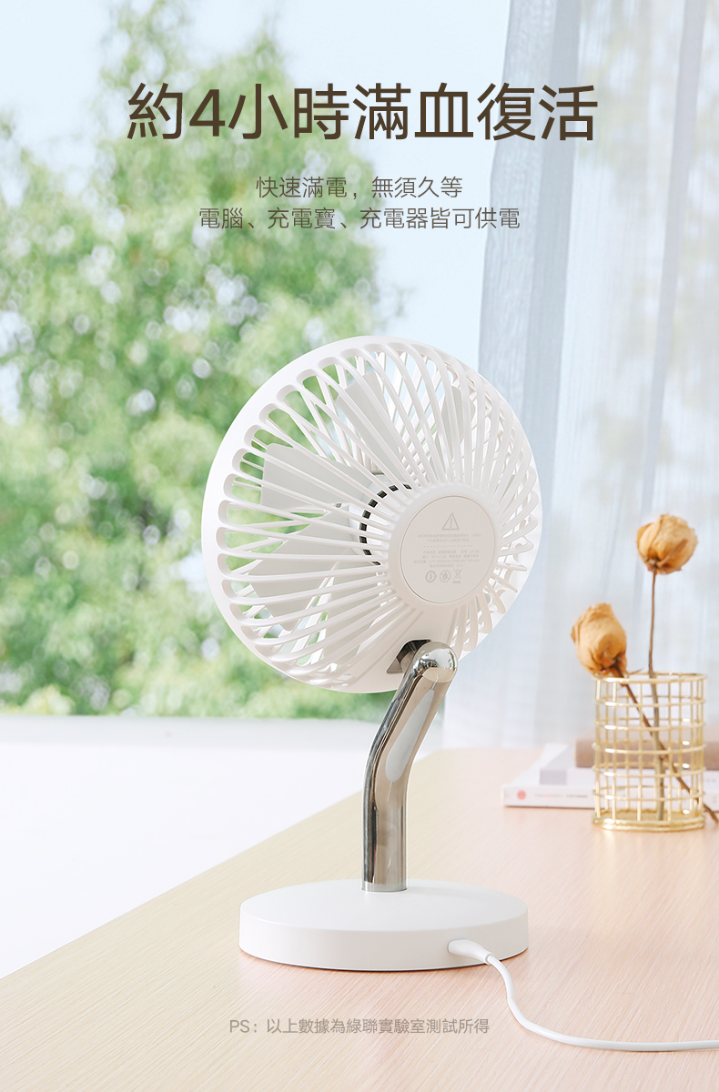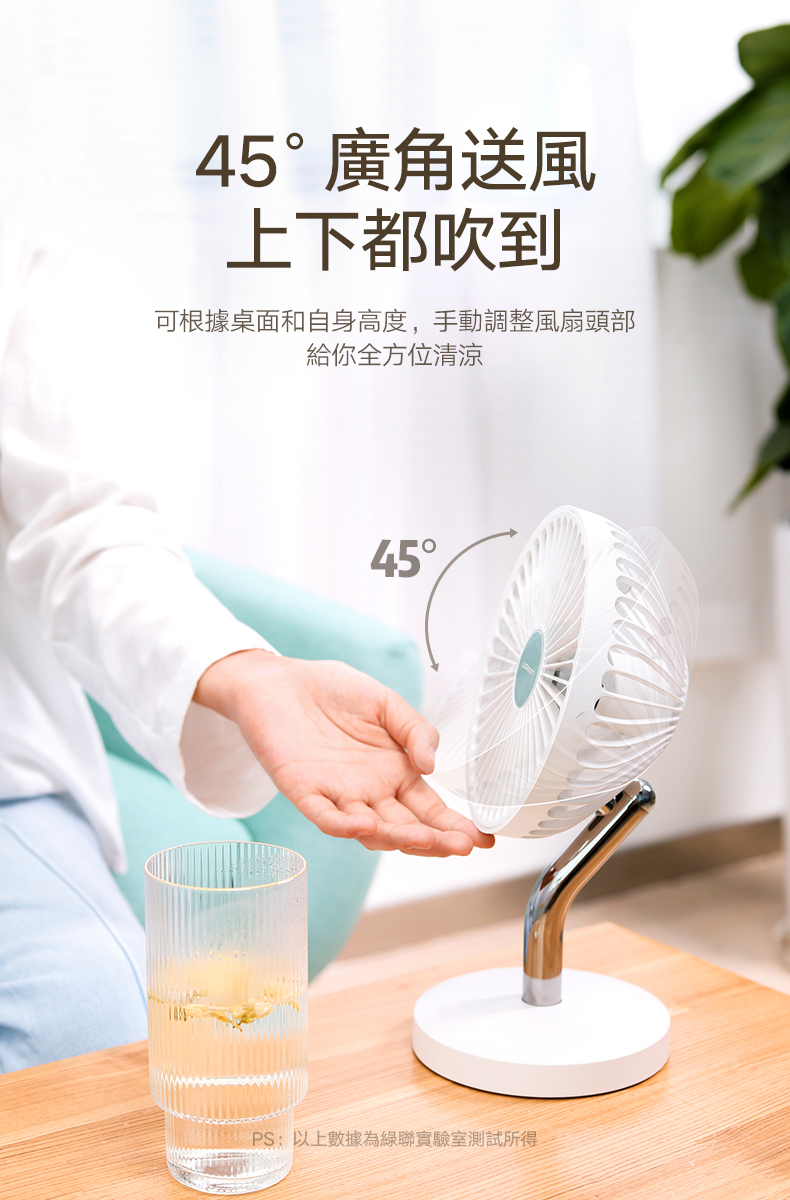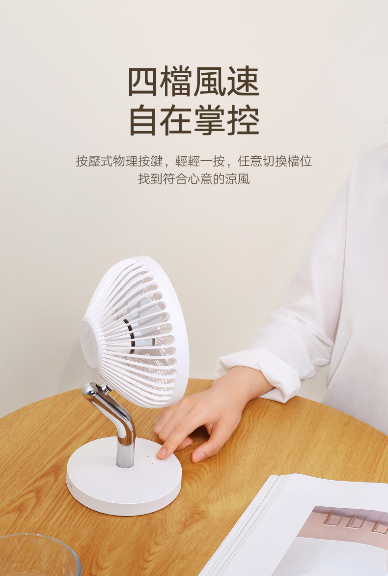 ◆四檔風速 自在掌控 ◆低分貝靜音運行 給您舒適環境 ◆僅566g 移動輕鬆不費力 ◆45度可調整 上下送風 ◆4000mAh大容量 15小時續航時間 ◆7扇葉 風量大且均勻
