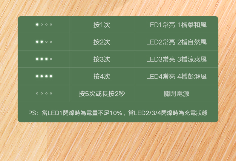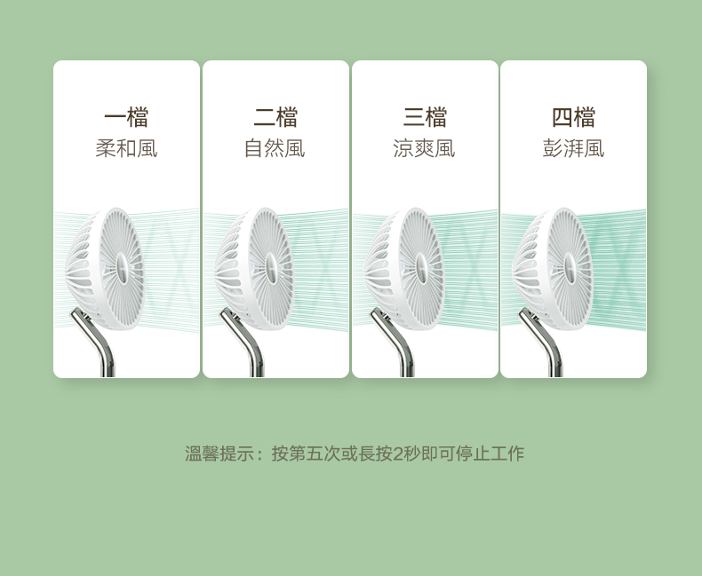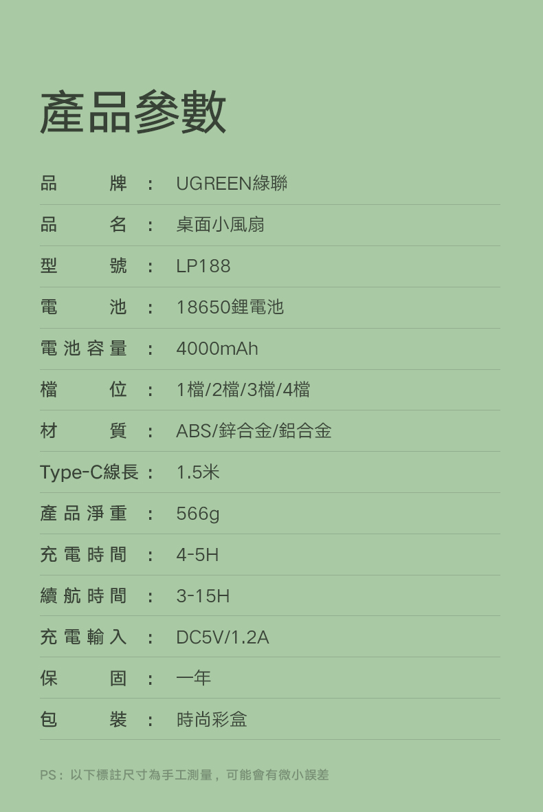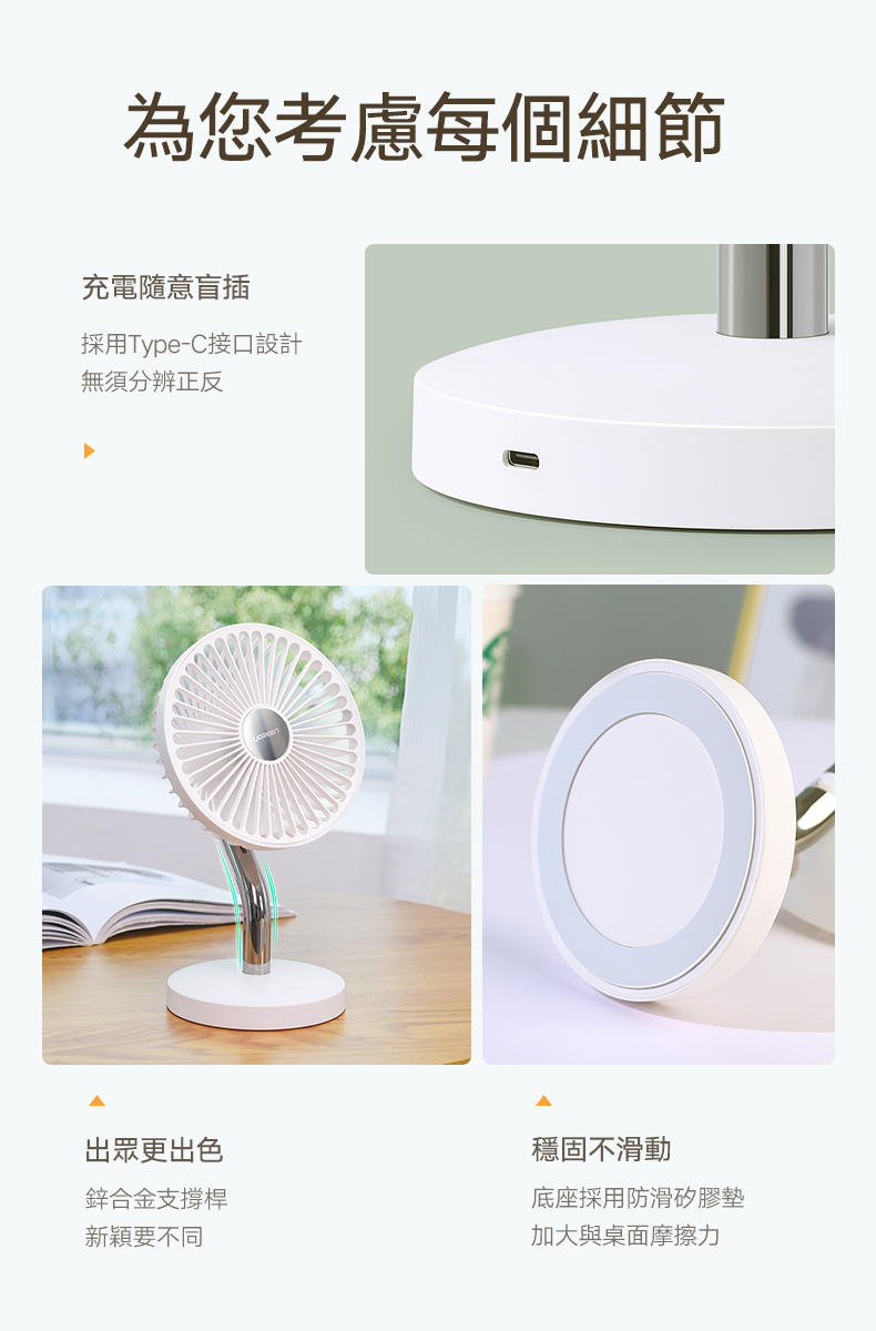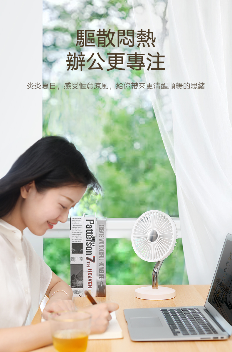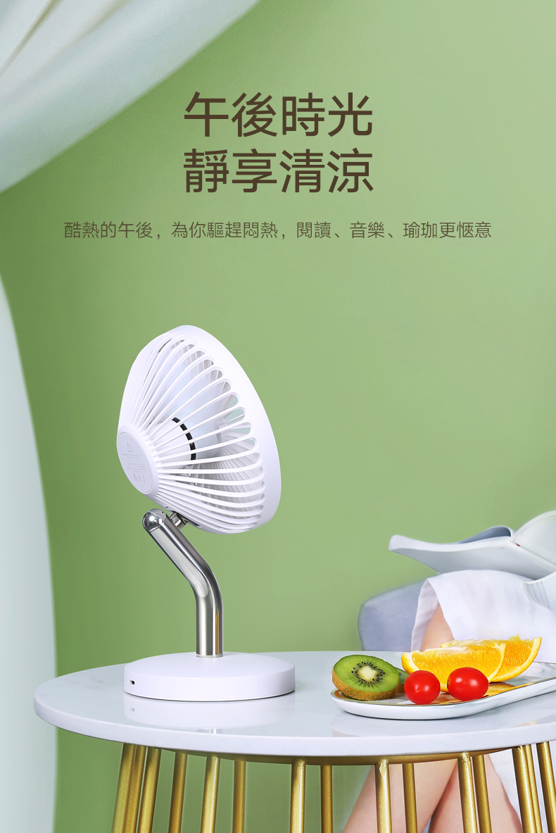 ◆四檔風速 自在掌控 ◆低分貝靜音運行 給您舒適環境 ◆僅566g 移動輕鬆不費力 ◆45度可調整 上下送風 ◆4000mAh大容量 15小時續航時間 ◆7扇葉 風量大且均勻