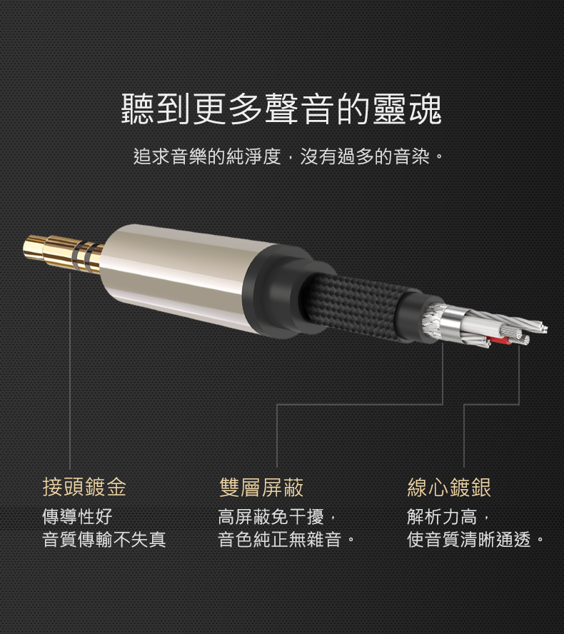 【商品特色】 ★鍍銀線芯★鍍金接口 ★高保真帶屏蔽 ★全新絞繞結構 ★柔軟更耐用 ★鋅合金外殼 ★耐磨耐用