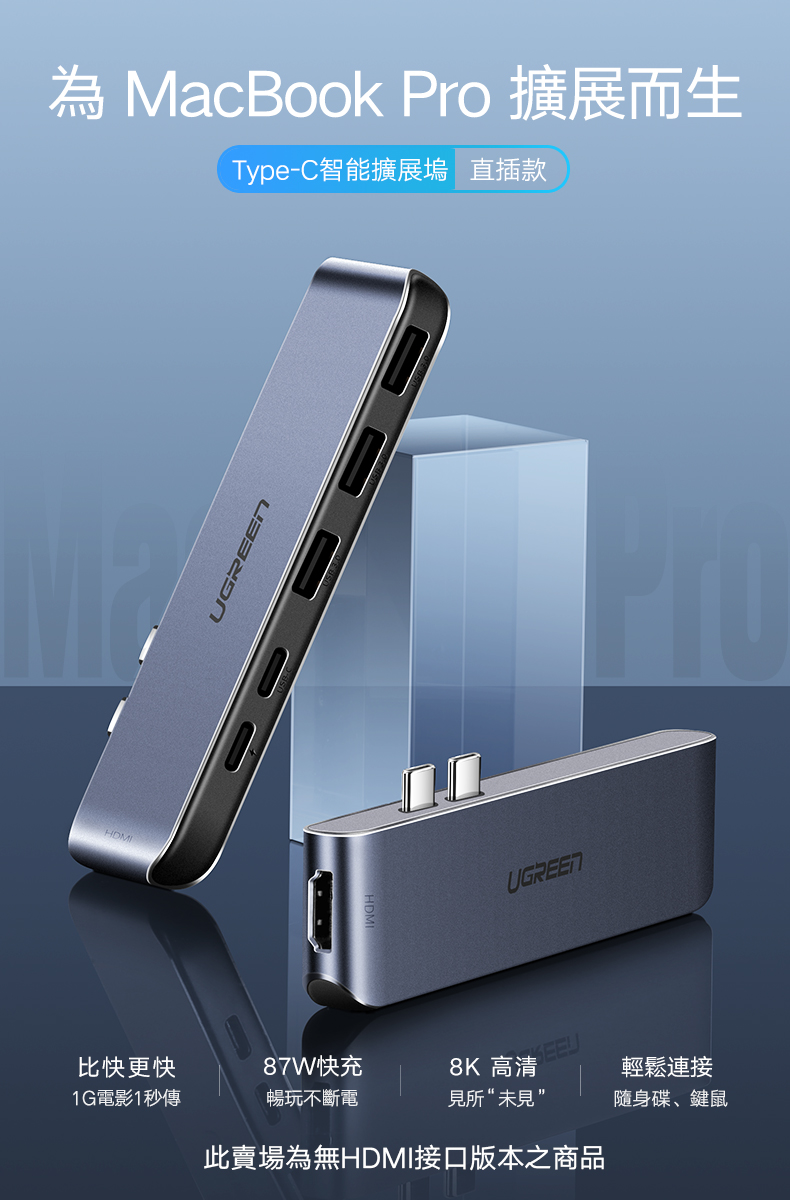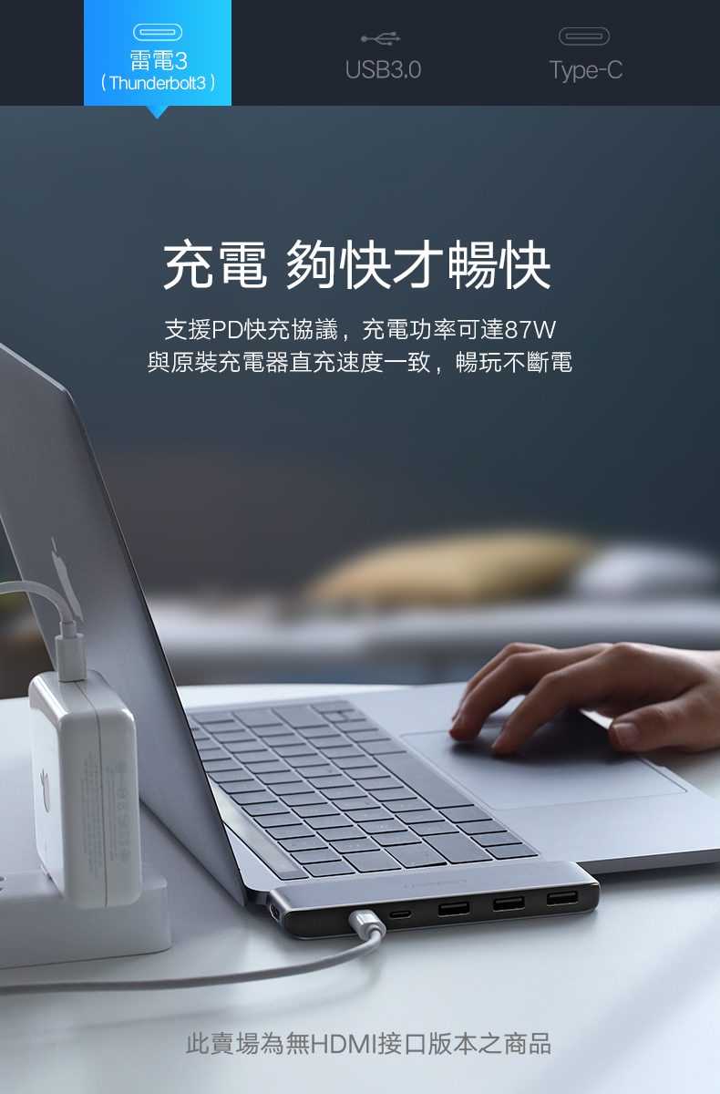 【商品特色】 ★BSMI許可字號:D45310 ★支援PD快充協議 ★充電功率可達87W ★隨身碟、鍵鼠輕鬆連接 ★MacBook Pro專屬 ★採用升級款獨立芯片傳輸穩定流暢 ★與MacBook Pro同樣工藝的鋁合金外殼