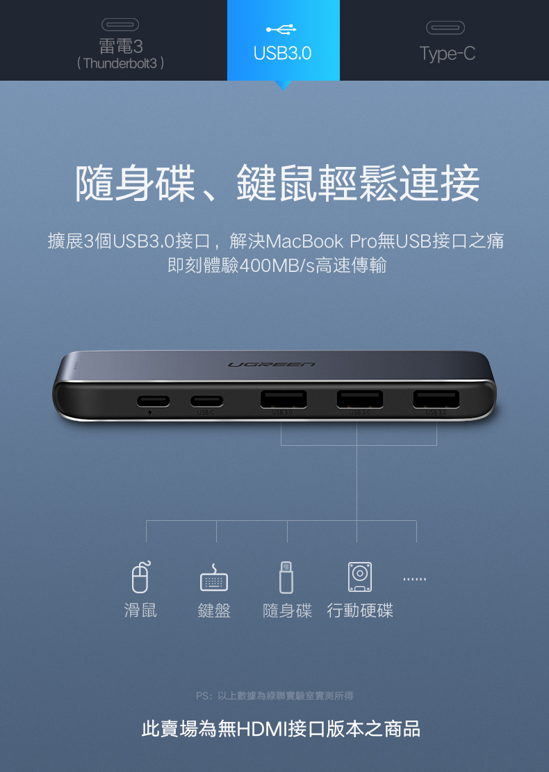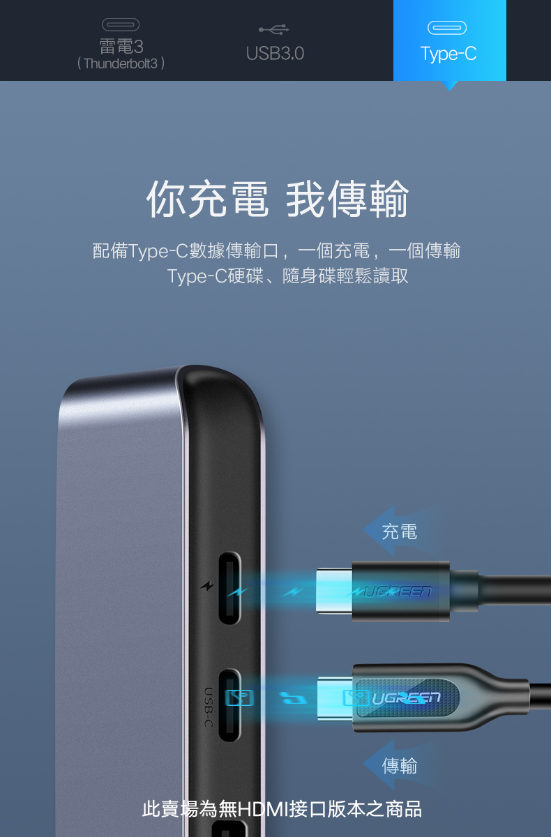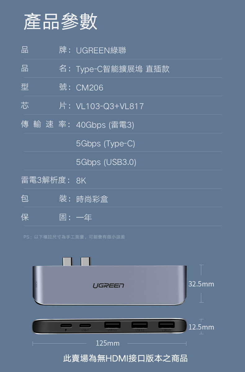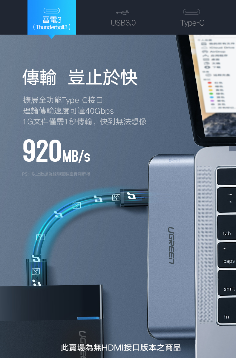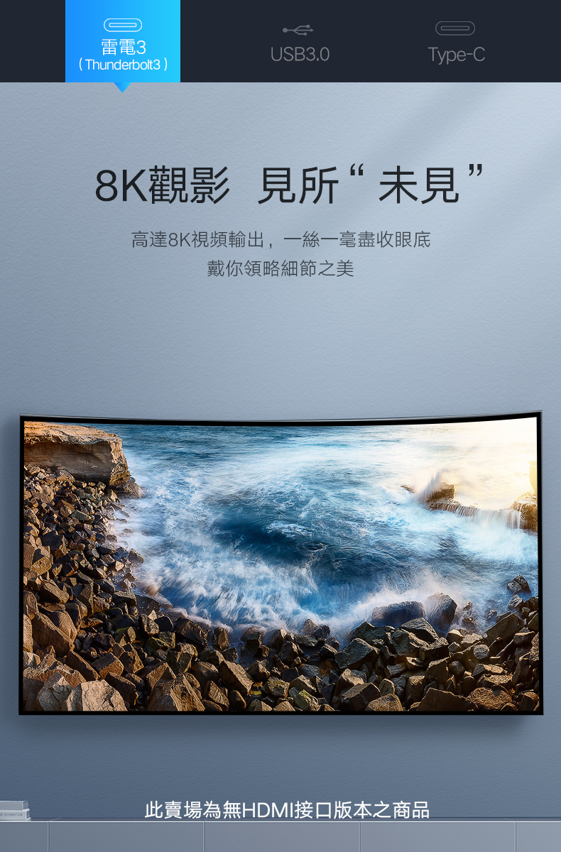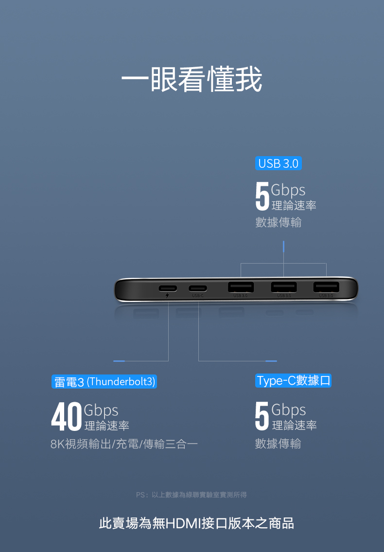 [拆封新品/福利品]綠聯MacBook集線器USB3.0*3+USB-C*2+PD+8K Thunderbolt3