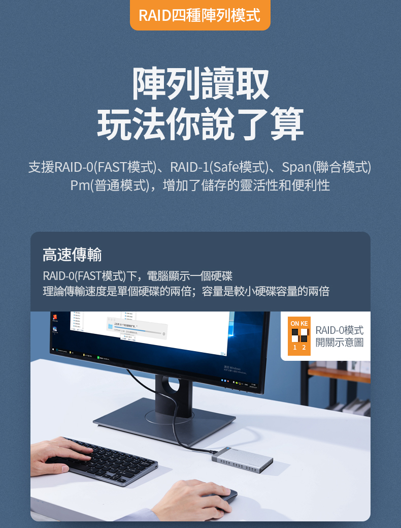 ◆陣列讀取 4種RAID模式 ◆閃電傳輸 真高速10Gbps ◆鏤空鋁合金 散熱更出色 ◆雙盤位擴展 滿足更多需求 ◆ASM1352R主控晶片穩定又高速 ◆15分鐘智慧休眠 保護硬碟 ◆此商品為SATA版本使用