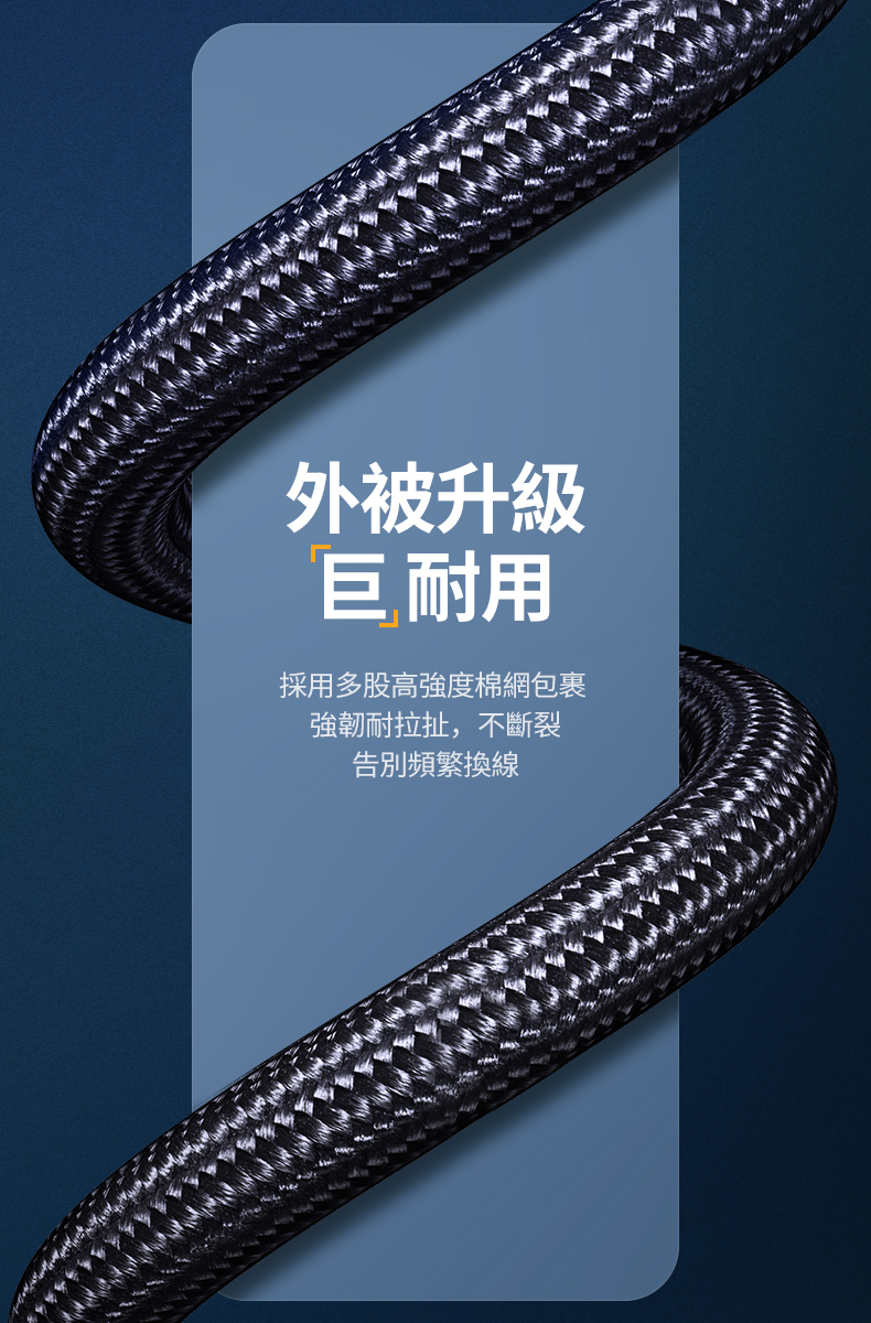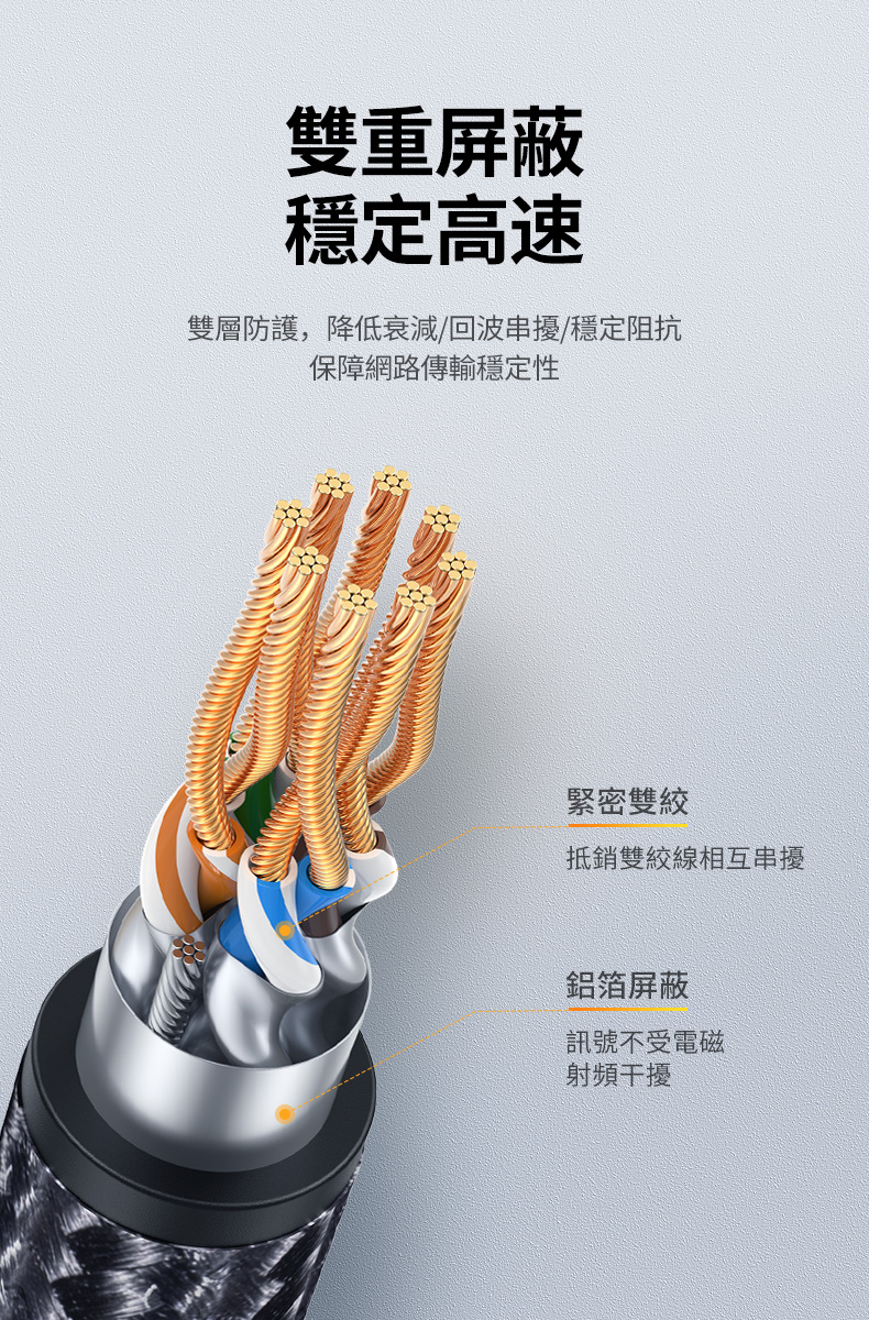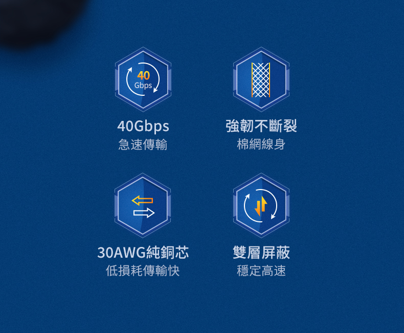 ◆40Gbps 急速傳輸 ◆棉網線身 強韌不斷裂 ◆30AWG純銅芯 低損耗傳輸快 ◆雙層屏蔽 穩定高速 ◆多股高強度棉網包裹 強韌耐拉扯