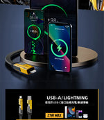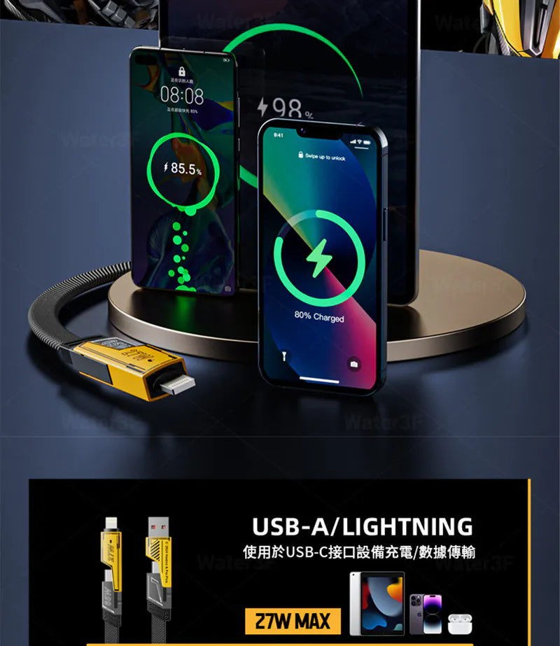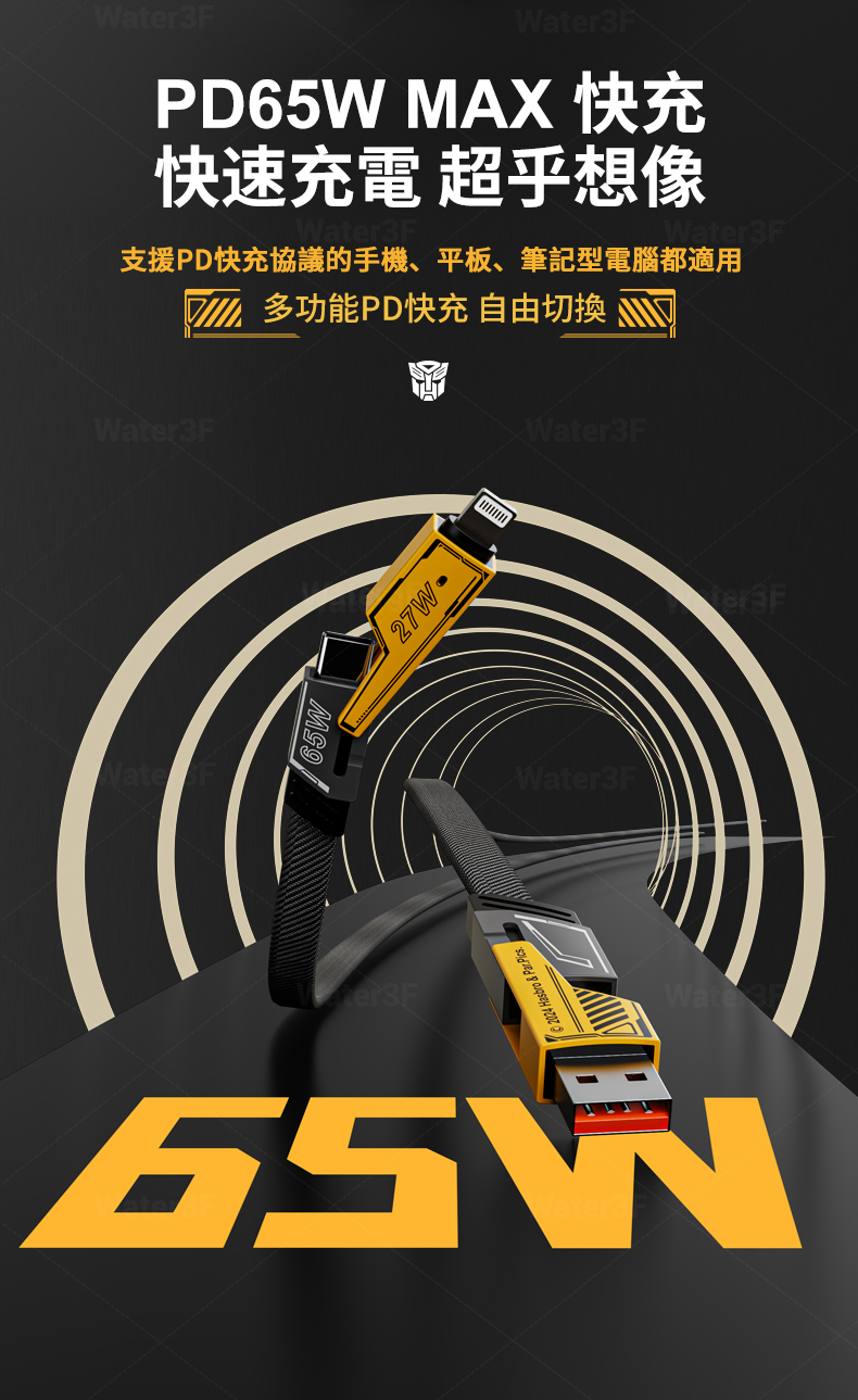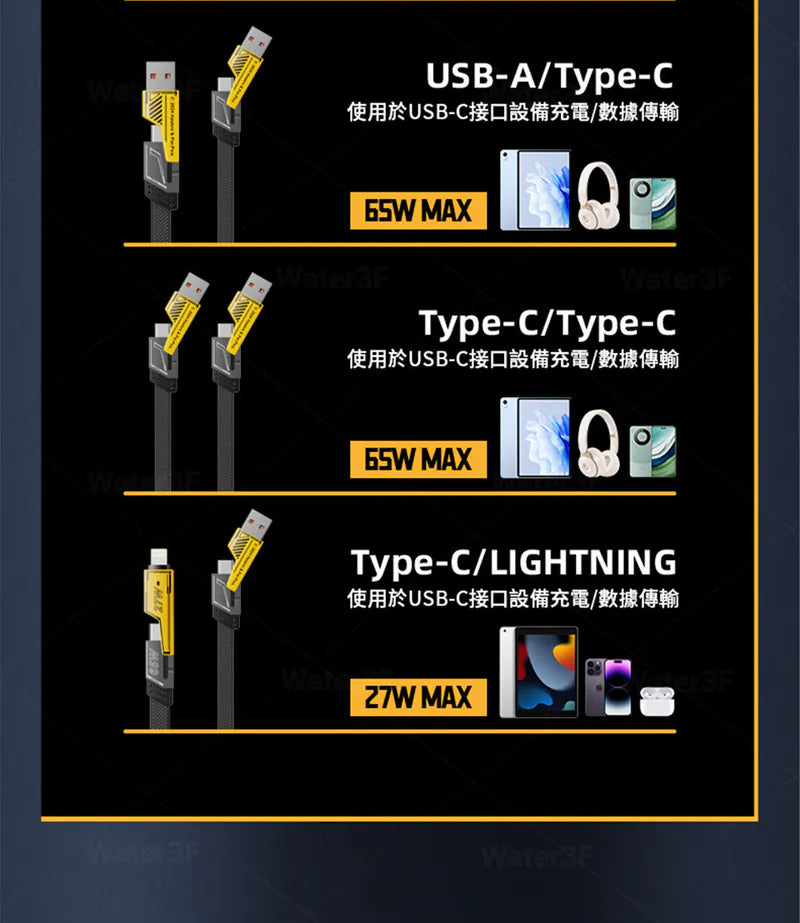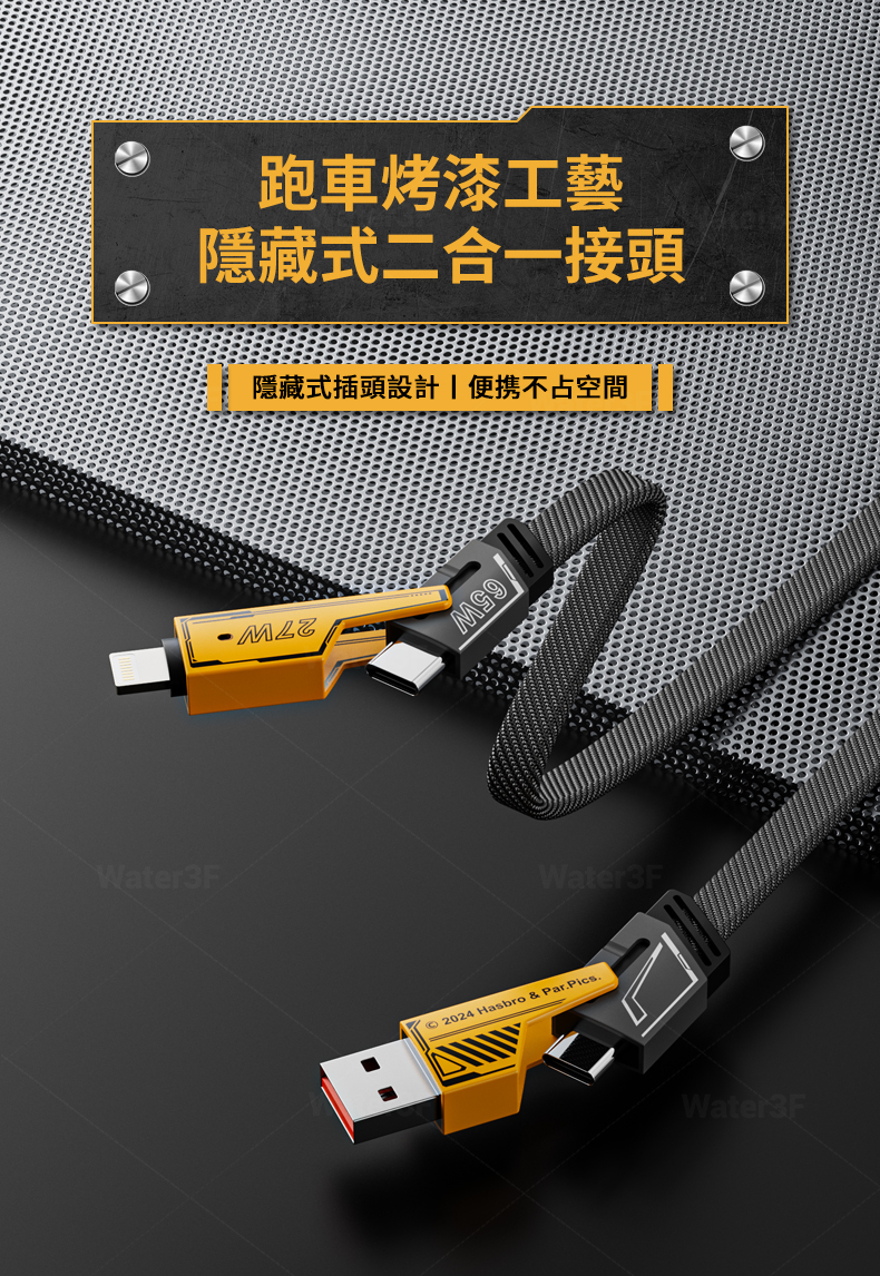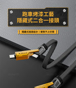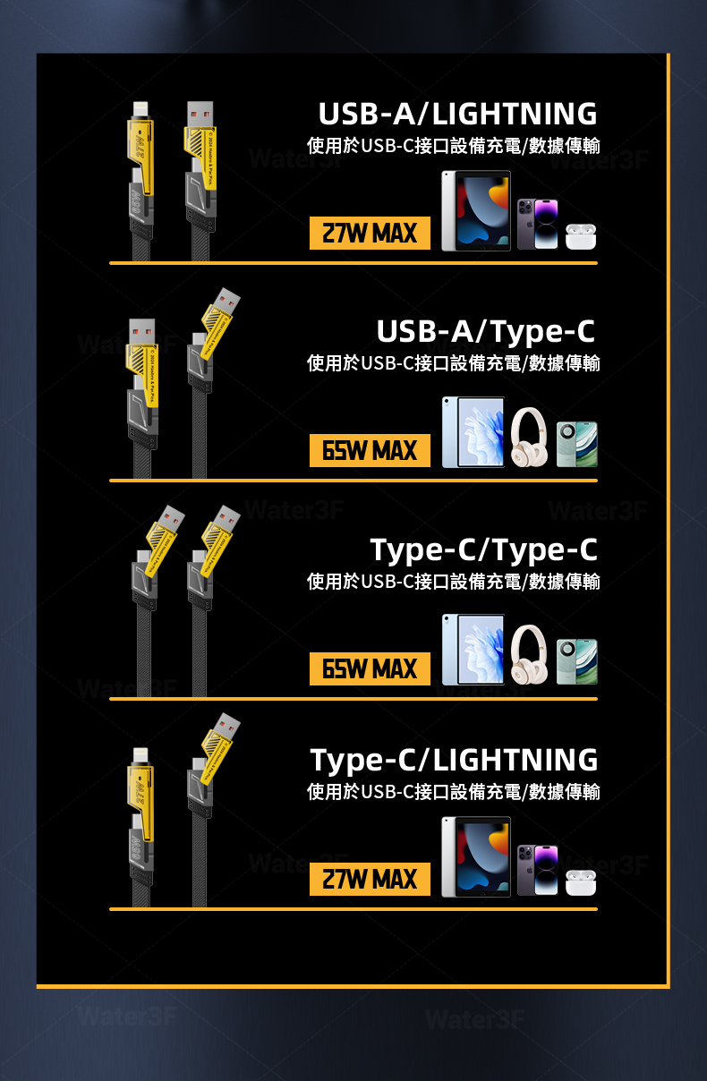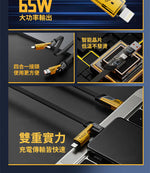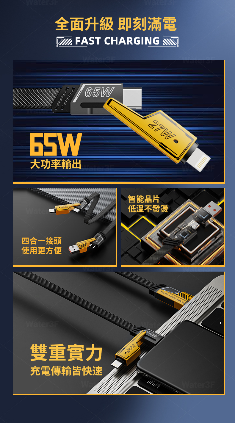.支援65W/27W快充&資料傳輸 .隱藏式四合一接頭,手機電腦一線搞定 .線芯升級加粗,安全高效 .智能晶片控溫,不傷機不發燙 .尼龍編織線身,堅固耐用不纏繞 .高質感合金接頭