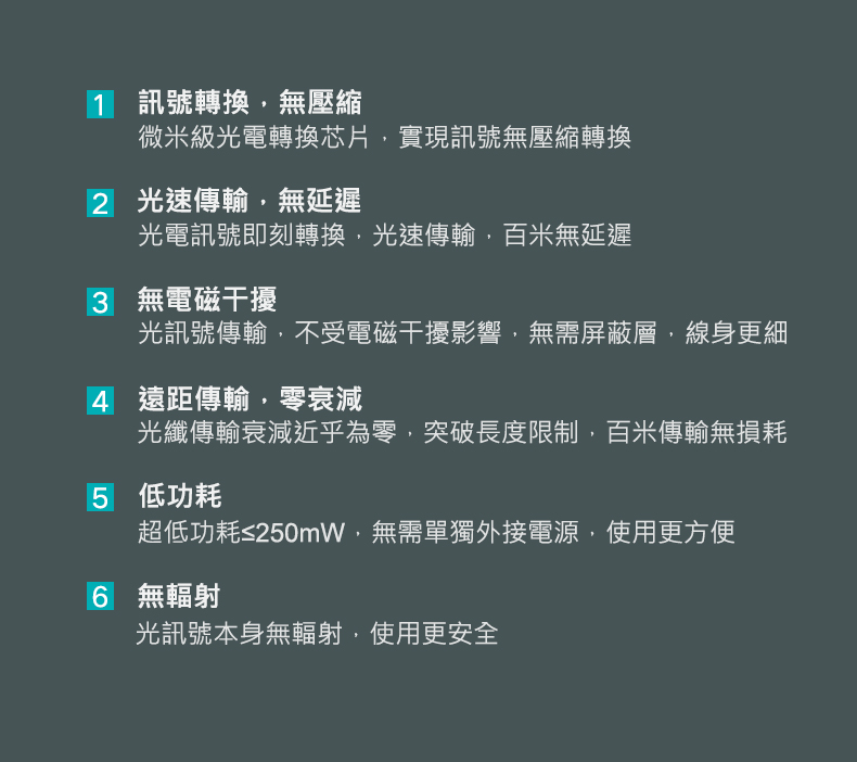 ★光速傳輸無延遲,訊號轉換無壓縮 ★無電磁干擾,遠距傳輸零衰減 ★低功耗無輻射,全長度支援HDMI2.0 ★鋅合金更強的保護 ★鍍金接口耐拔插不生鏽
