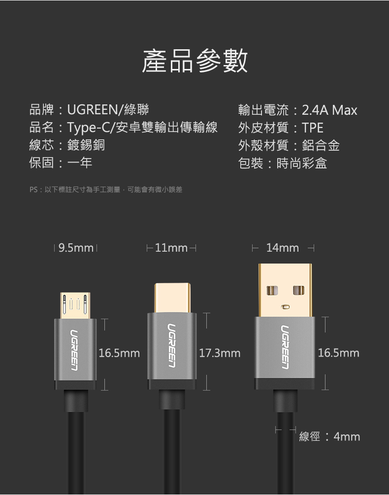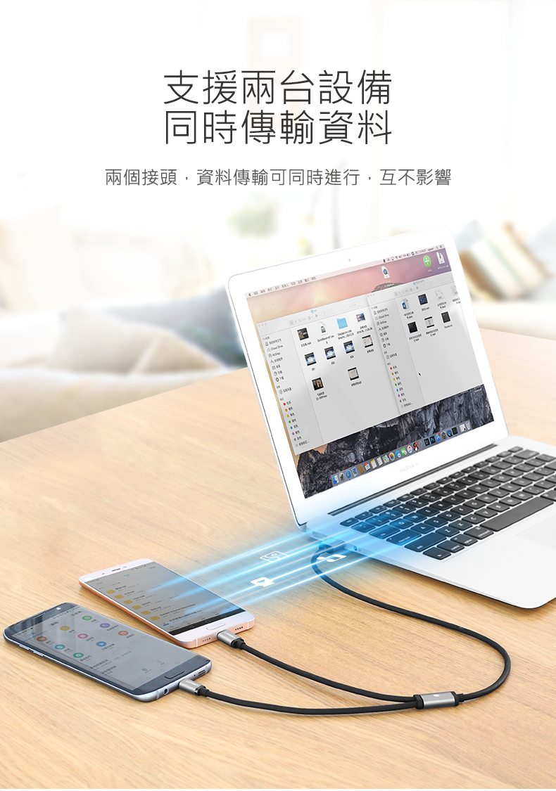 商品特色 ★Type-C/安卓雙輸出,安全充電不傷電池 ★安卓系列全相容 ★支援兩台設備同時傳輸資料 ★加強接頭不斷裂,合金外殼更耐用