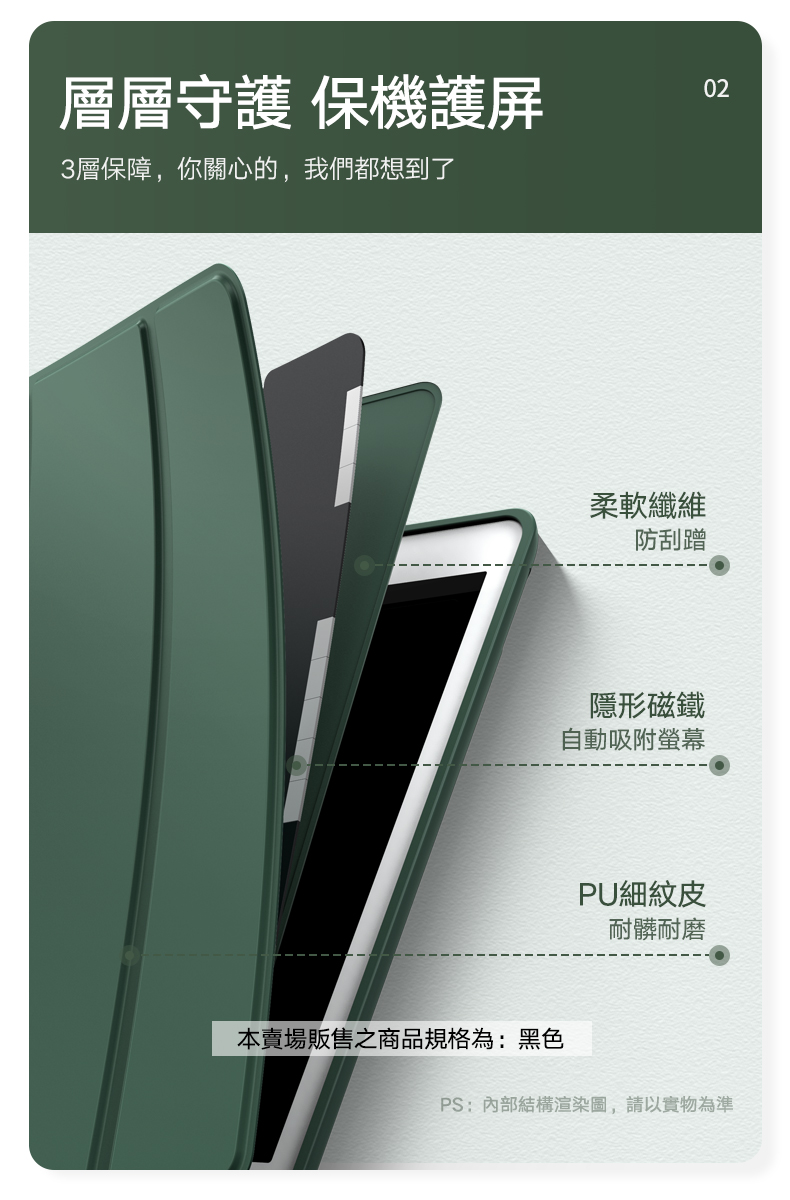 ◆全包式保護 減震抗摔 ◆柔軟纖維/隱形磁鐵/PU細紋皮三層保護 ◆內置鏤空雙扣設計筆槽 輕鬆取放 ◆創意摺疊設計 智慧磁吸 ◆自動喚醒/休眠 減少待機耗能 ◆1:1真機開模 孔位契合不頂膜 ◆內部立體蜂巢設計 快速散熱