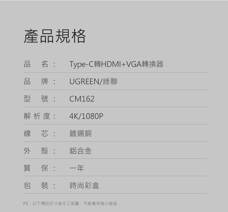 【商品特色】 ★HDMI+VGA雙口同時輸出 ★支援PD邊充邊玩 ★4K/1080P高清視效 ★即插即用支援熱插拔 ★雙核心晶片畫面不卡頓不閃爍 ★鍍鎳接口阻抗低傳輸快