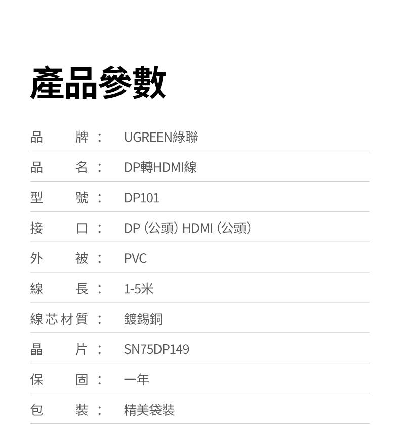 商品特色 ★ 4K高畫質 畫面細膩 ★SN75DP149 高性能轉換芯片 ★ 鍍金工藝插頭 拒絕生鏽 ★ 鍍錫銅線芯 雙重屏蔽杜絕干擾 ★7.3mm線徑 環保PVC柔軟耐彎折