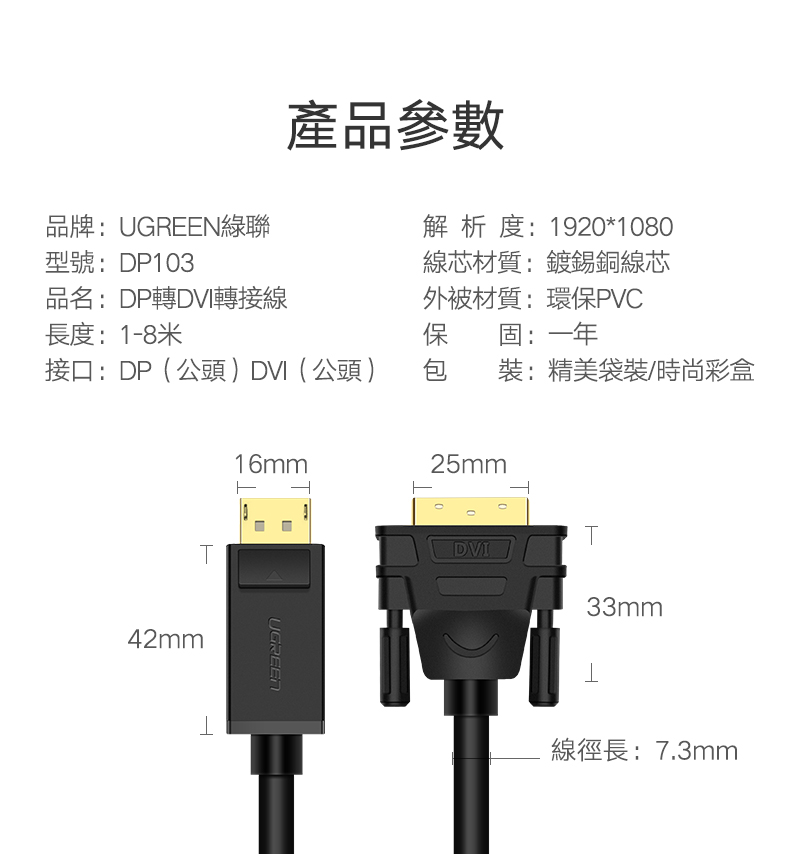 商品特色 ★ 僅支援DP轉DVI ★ 不支援雙向互轉 ★ 1080P高清顯示 ★ 雙螢幕:鏡像/擴展模式 ★ PS8121E轉換芯片穩定清晰 ★ 鋁箔層+編織網雙重抗干擾,鍍金接口不生鏽耐插拔