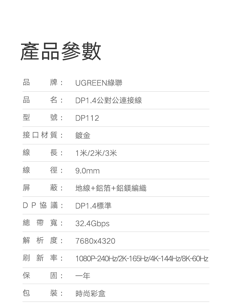 ◆8K高清畫質 ◆32.4Gbps總帶寬 165Hz高刷新率 ◆支援3D立體成像技術 ◆支援32位音頻通道 呈現豐富音頻 ◆多重屏蔽保護 畫質穩定拒絕閃屏 ◆加厚鍍金接口 耐氧化歷久彌新 ◆按壓式卡扣設計 連接穩定牢固 ◆原廠編號:60843