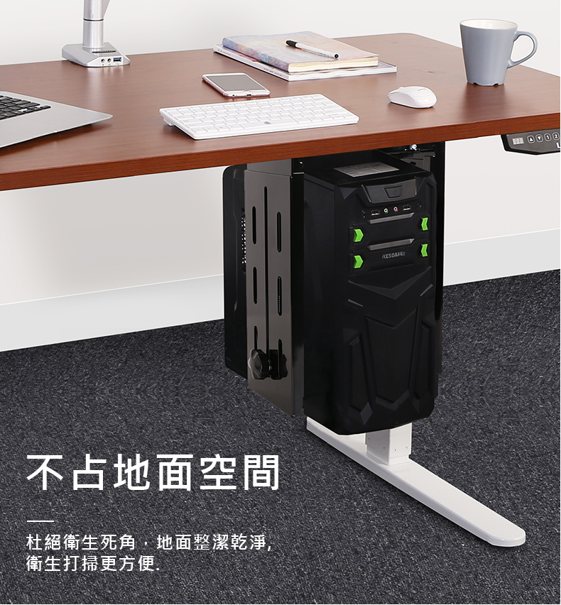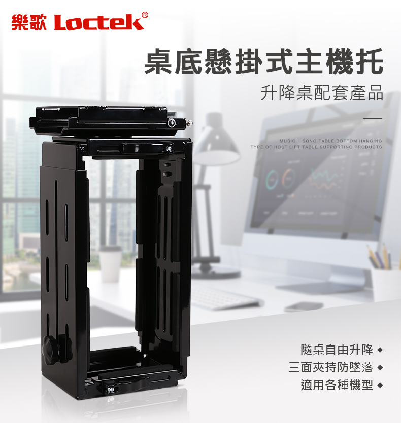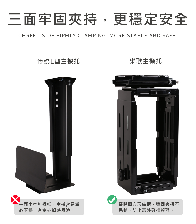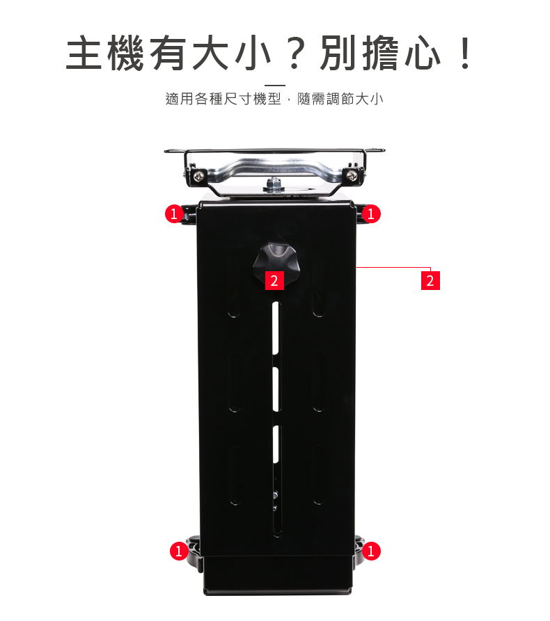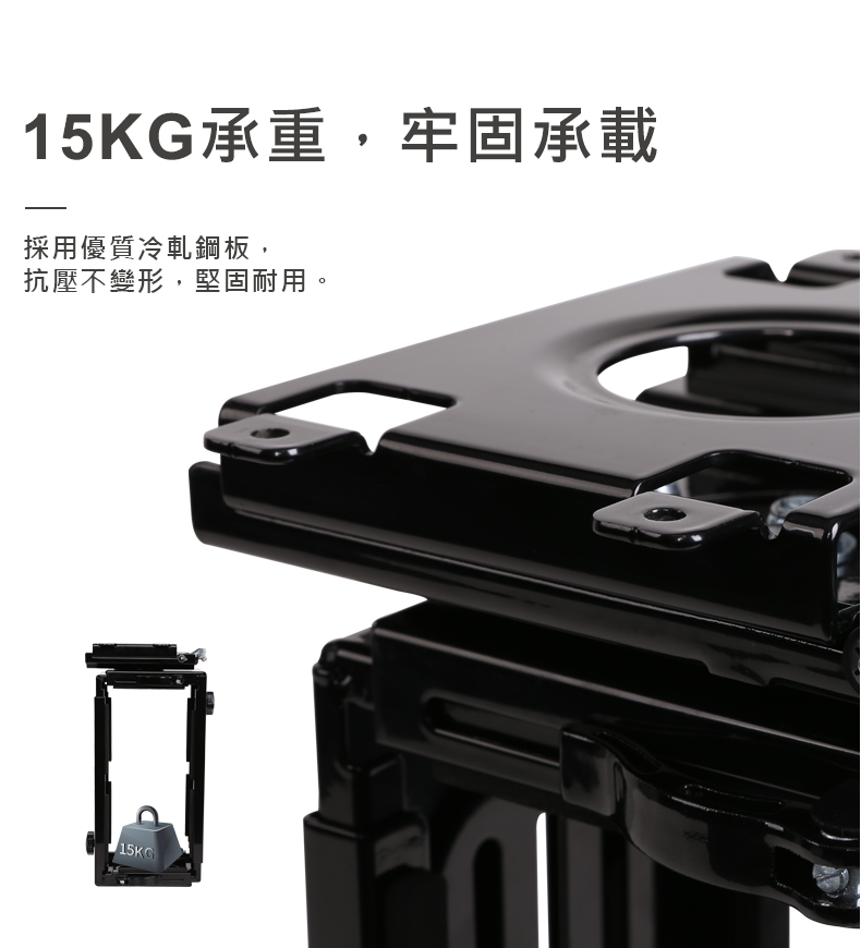 商品特色 ★ 隨桌自由升降 ★ 三面夾持穩定安全防墜落 ★ 自帶安全螺釘給機箱加上雙保險 ★ 適用各種尺寸機型,隨需調節大小 ★ 15KG承重牢固承載