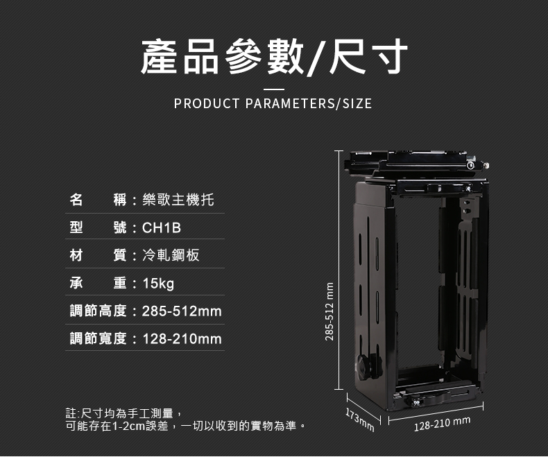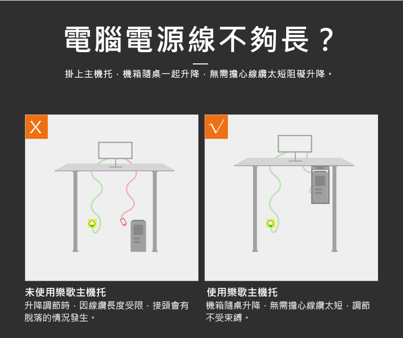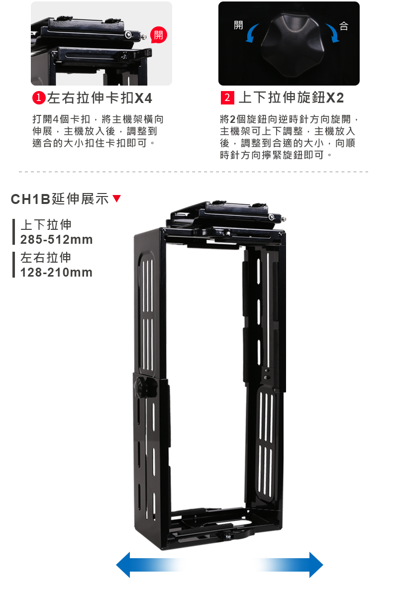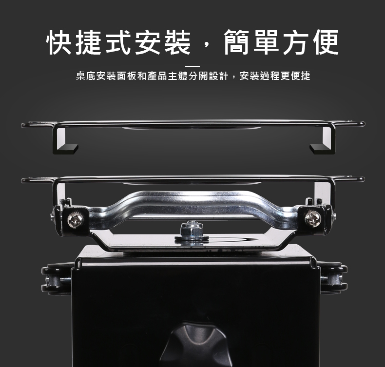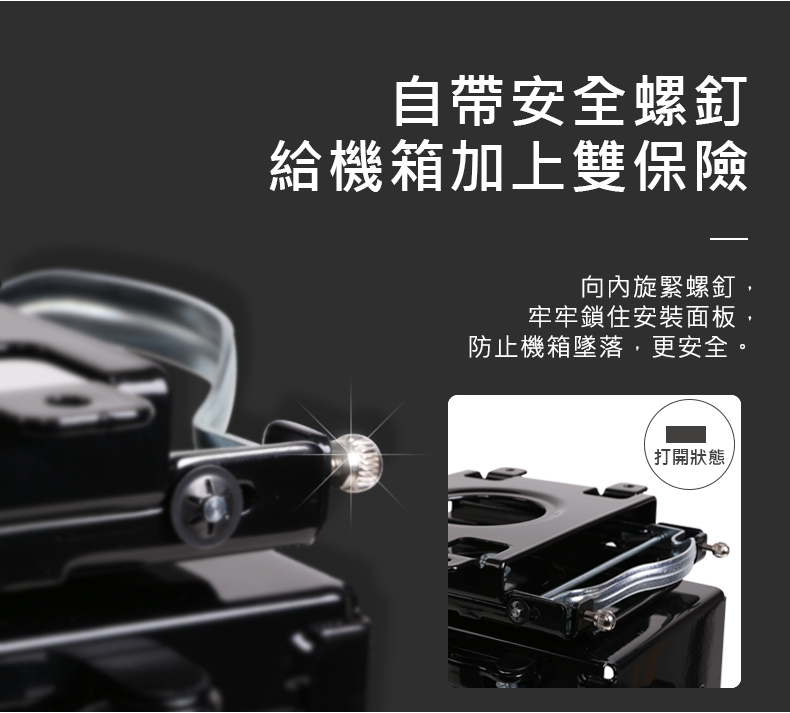 商品特色 ★ 隨桌自由升降 ★ 三面夾持穩定安全防墜落 ★ 自帶安全螺釘給機箱加上雙保險 ★ 適用各種尺寸機型,隨需調節大小 ★ 15KG承重牢固承載