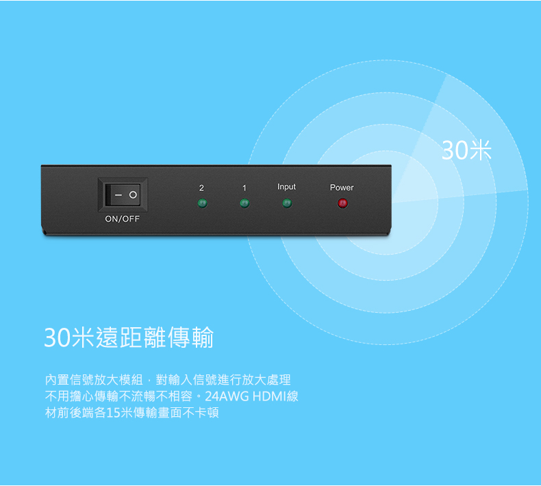 商品特色 ★放大訊號傳送3D視效 ★1080P高清就是清晰,30米遠距離傳輸 ★低功耗晶片性能穩定 ★過電保護性能穩定,散熱設計壽命長久
