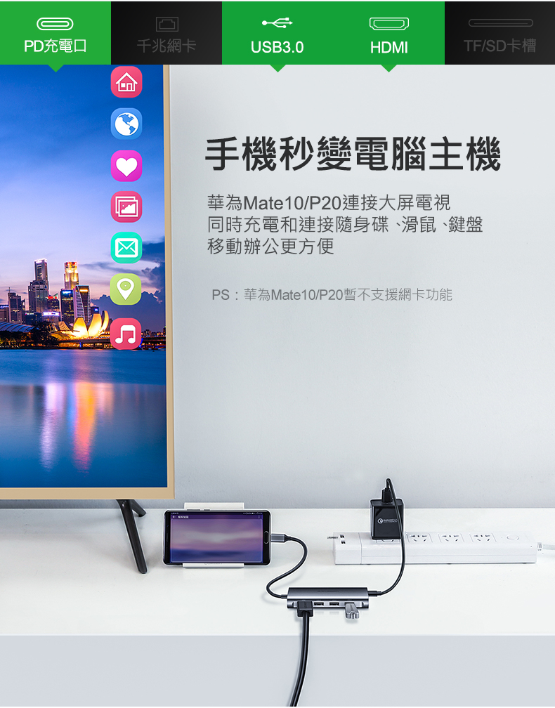 【商品特色】 ★BSMI許可字號:D45310 ★一物多用連接多設備 ★PD充電邊充邊玩不掉電 ★連接有線網路傳輸更穩定 ★帶三個USB3.0接口,連接電視/投影機 ★TF/SD卡同時讀取,全鋁合金散熱快性能穩定 ★原廠外箱破損/產品外觀略有磨損/配件完整/功能正常★