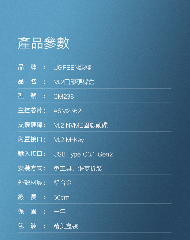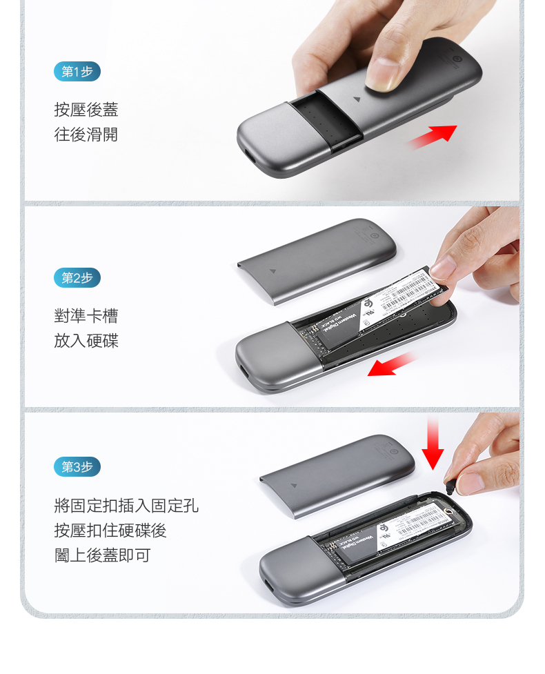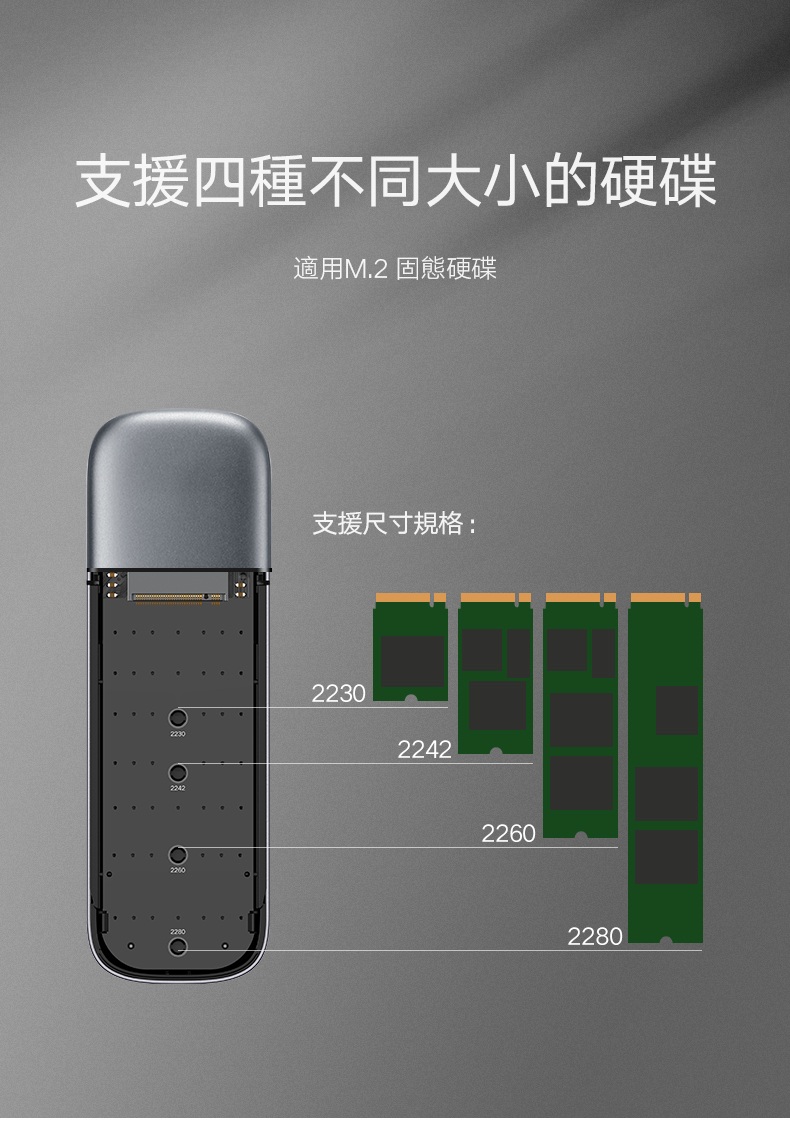 商品特色 ★M.2 SSD固態硬碟變身行動硬碟 ★1G文件1秒傳取 ★創新滑蓋設計 ★全鋁合金輕薄外殼 ★支援四種不同大小的硬碟,支援Type-C接口設備連接 ★隨身便攜輕鬆裝進口袋 ★免工具安裝 ★32AWG加粗鍍錫銅芯穩定傳輸