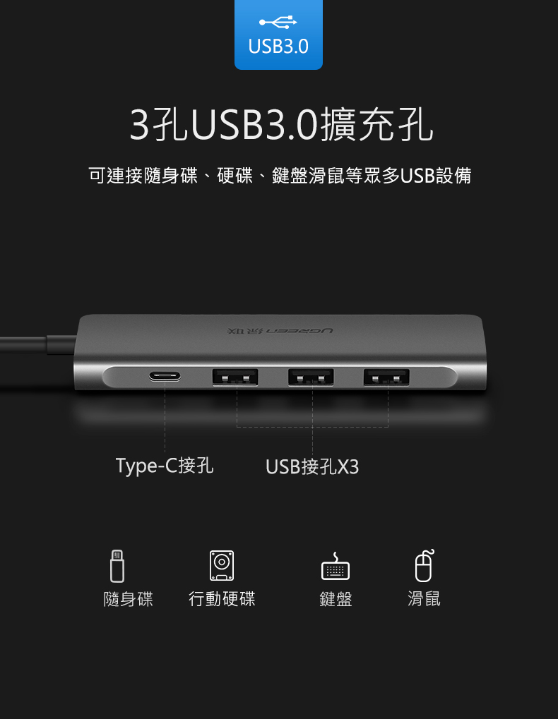【商品特色】 ★BSMI許可字號:D45310 ★3孔USB3.0擴充孔 ★即插即用無須驅動 ★散熱快不發燙 ★三主控晶片傳輸更穩定 ★適用所有Type-C接口設備