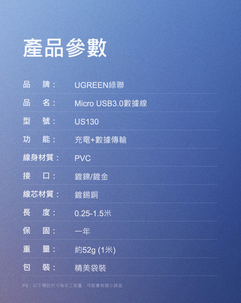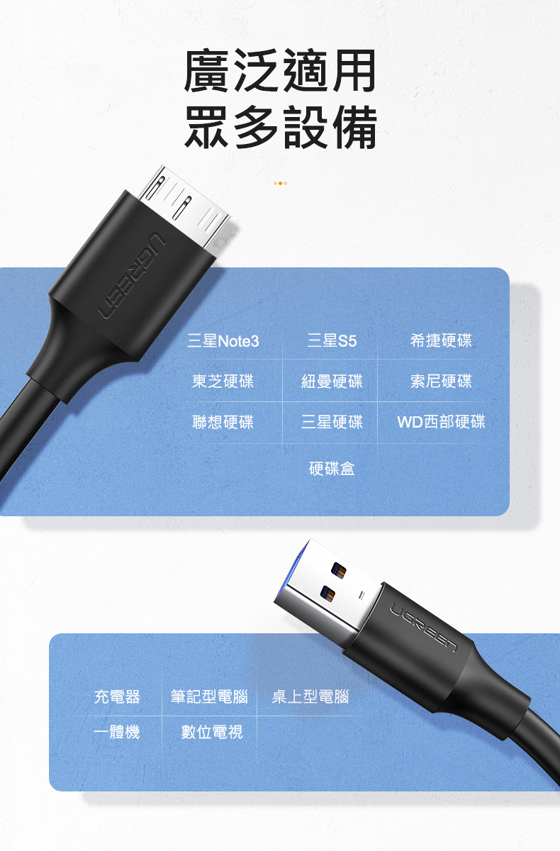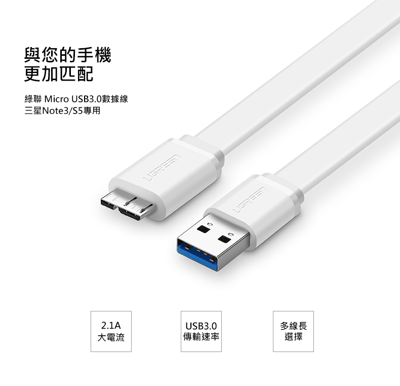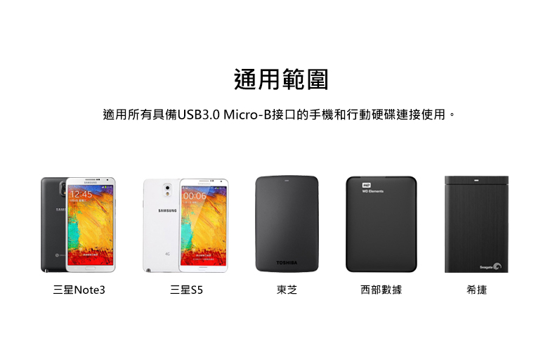 商品特色 ★ 2.1A大電流 ★ USB3.0傳輸速率 ★ 適用所有具備USB3.0 Micro-B接口的手機和行動硬碟連接使用
