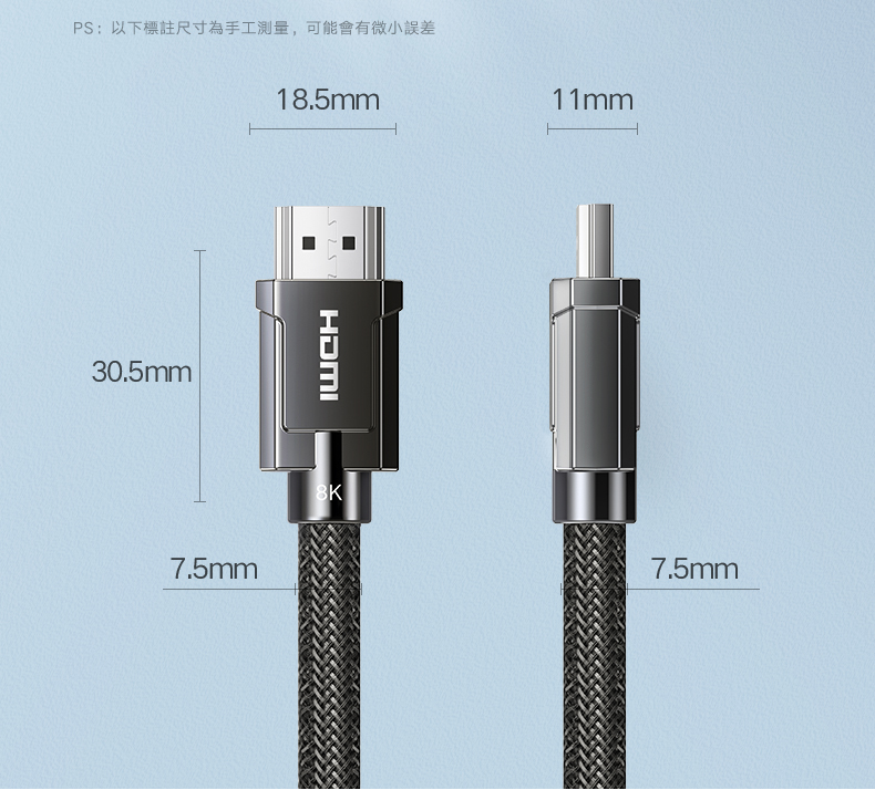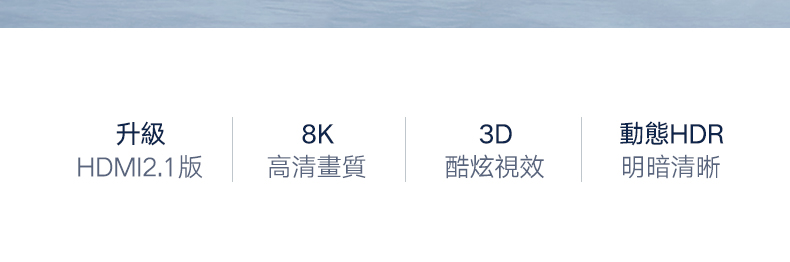 ◆升級HDMI2.1版 ◆動態HDR 每一幀每一幕都清晰 ◆加強音訊回傳通道 提供高解析音訊 ◆快速媒體切換 圖像聲音更快同步 ◆快速幀傳輸 傳輸更快更強 ◆即插即用 可向下兼容 ◆高強度尼龍編織網 不開裂更耐磨
