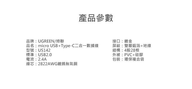 商品特色 ★高速傳輸、充電快/雙接口 ★Micro USB/TYPE-C皆可用 ★2.4A大電流快充 ★純銅地線+雙層鋁箔 ★鍍金接口更耐用 ★原廠外箱破損/產品外觀略有磨損/配件完整/功能正常