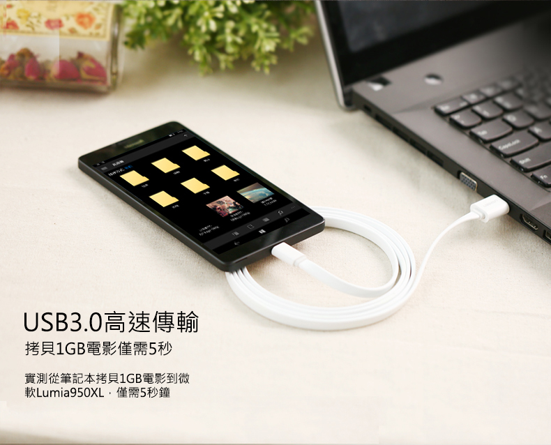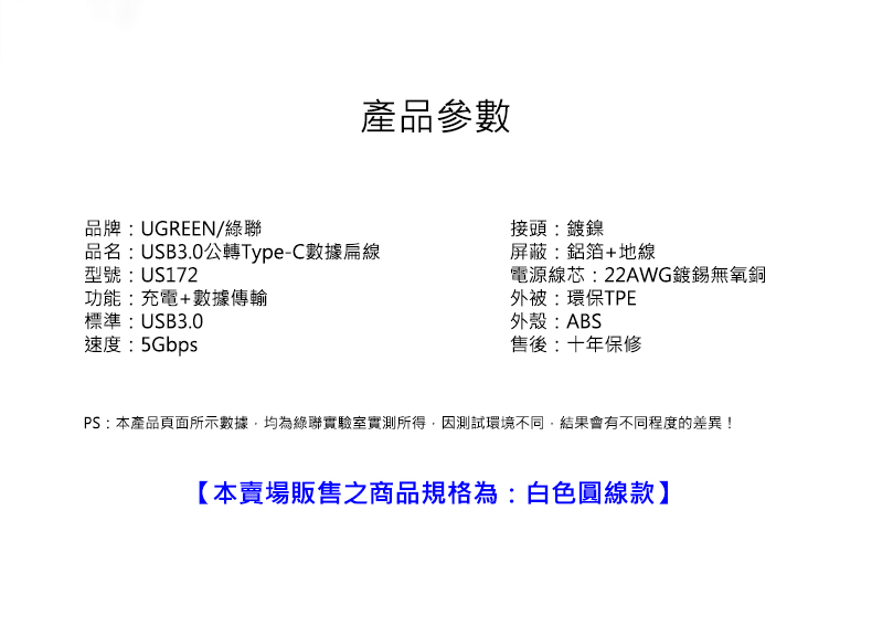 【商品特色】 ★5Gbps速率 ★支援QC3.0快充技術 ★鋁箔安全屏蔽 ★電阻限流保護 ★美規22AWG加粗銅芯 ★本賣場販售之規格為:白色圓線款 ★原廠外箱破損/產品外觀略有磨損/配件完整/功能正常★