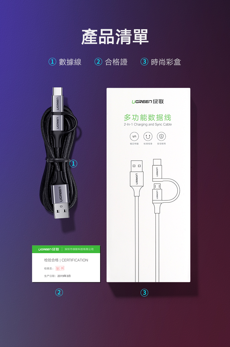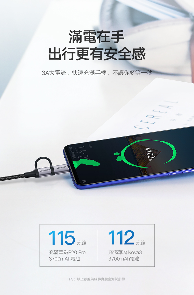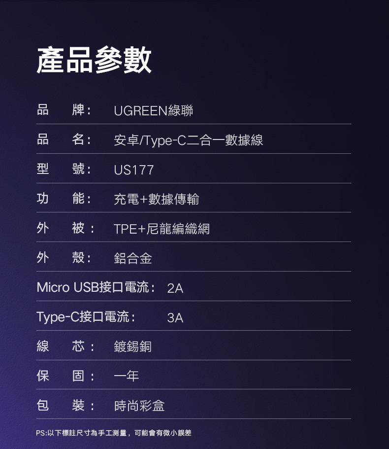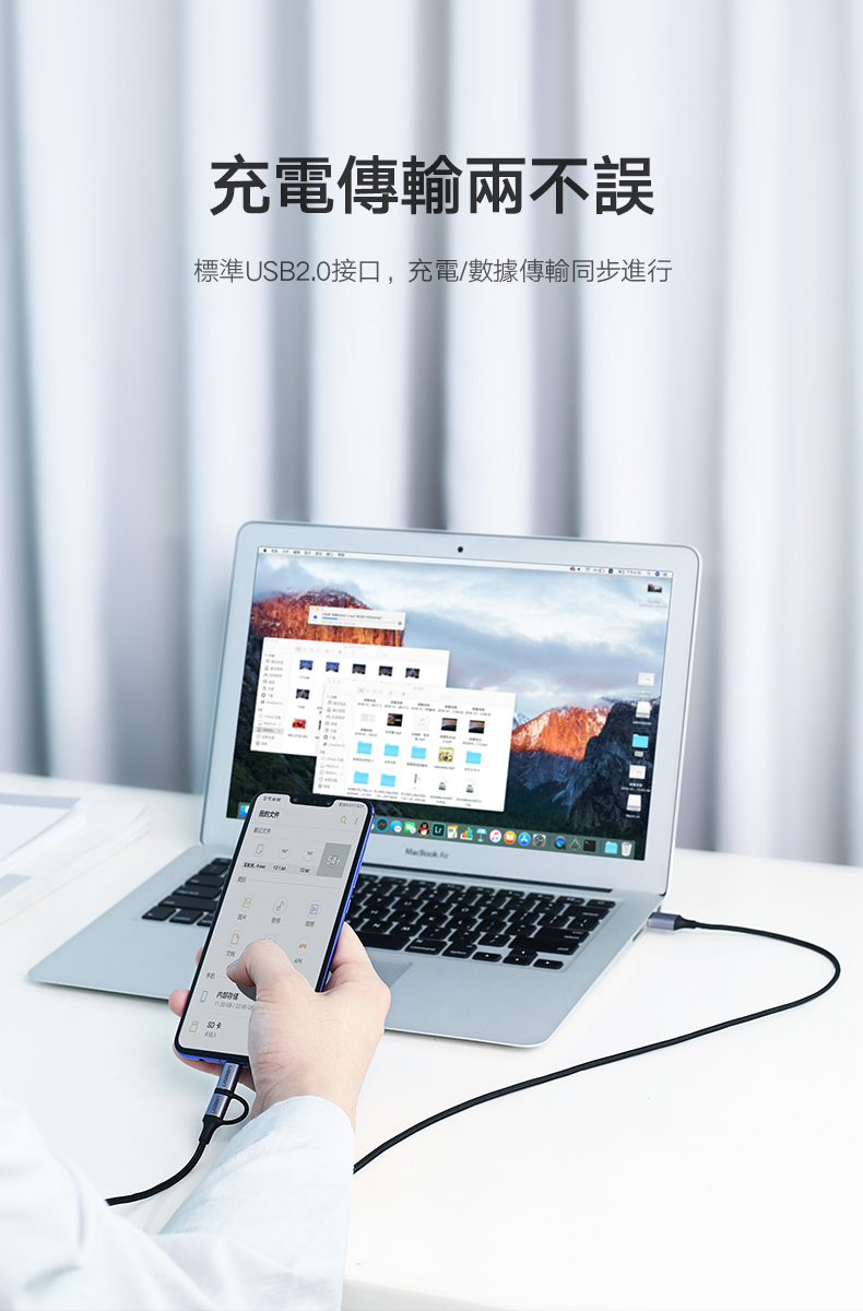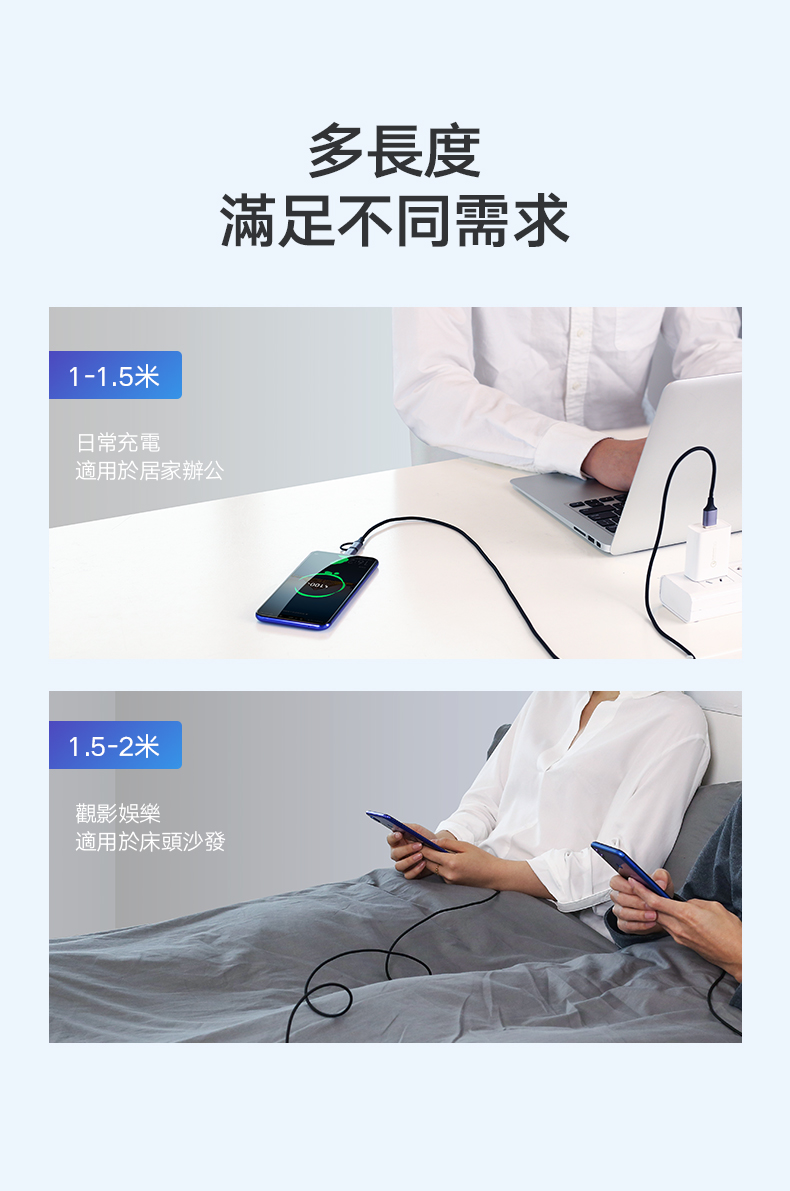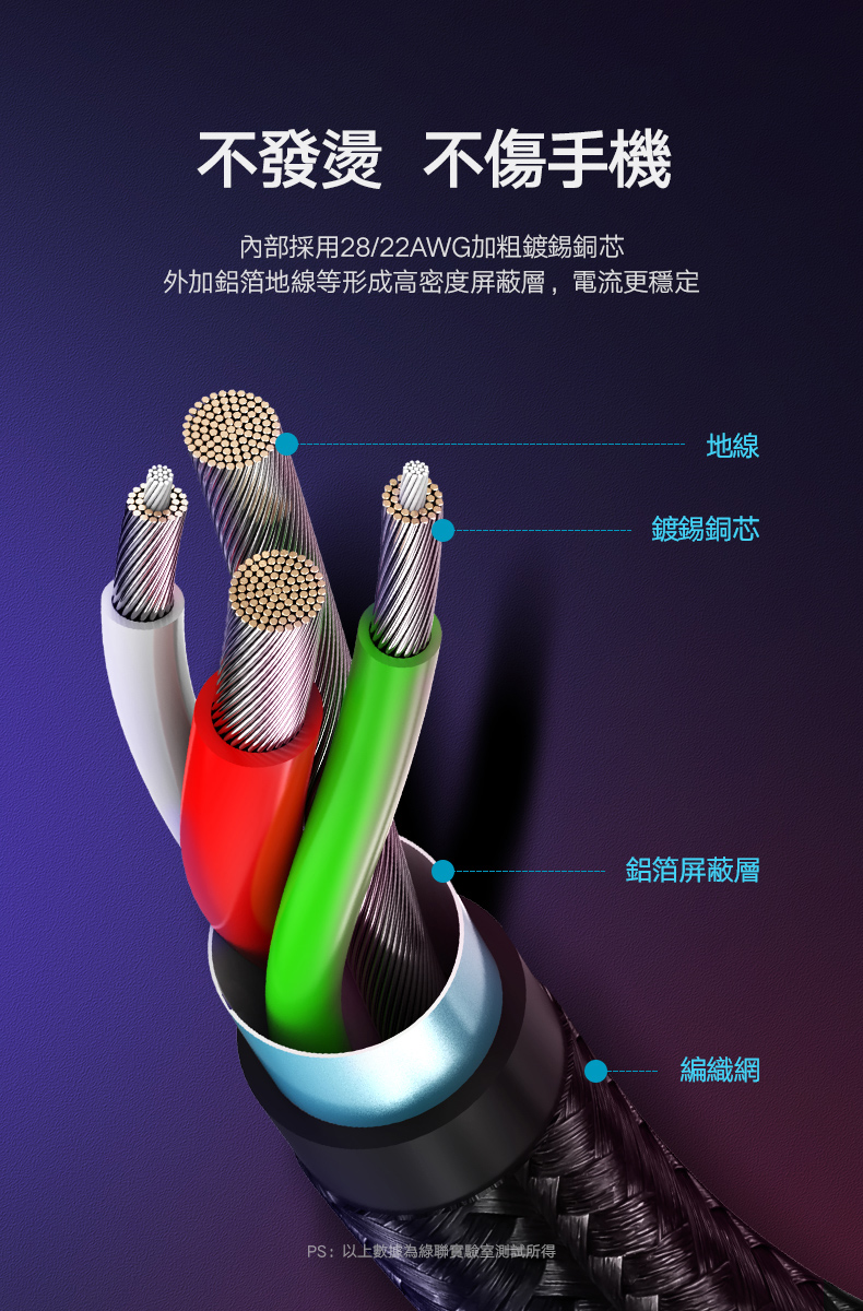 商品特色 ★一線兩頭切換自由 ★3A大電流快速充滿手機 ★28/22AWG加粗鍍錫銅芯電流更穩定 ★高強度尼龍編織網,不開裂更耐磨, ★網尾加固不斷裂更耐用,接頭一體拉伸而成不鬆動耐插拔 ★升級鋁合金外殼不生鏽久用如新
