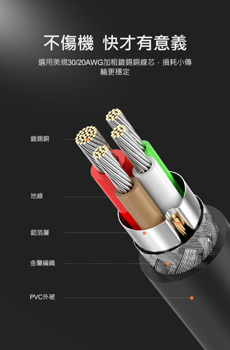 【商品特色】 ★3A快充電流,40MB/s傳輸 ★不傷機快才有意義 ★適用PD充電協議設備 ★網尾加長加固不易脫線 ★嚴苛測試精選品質