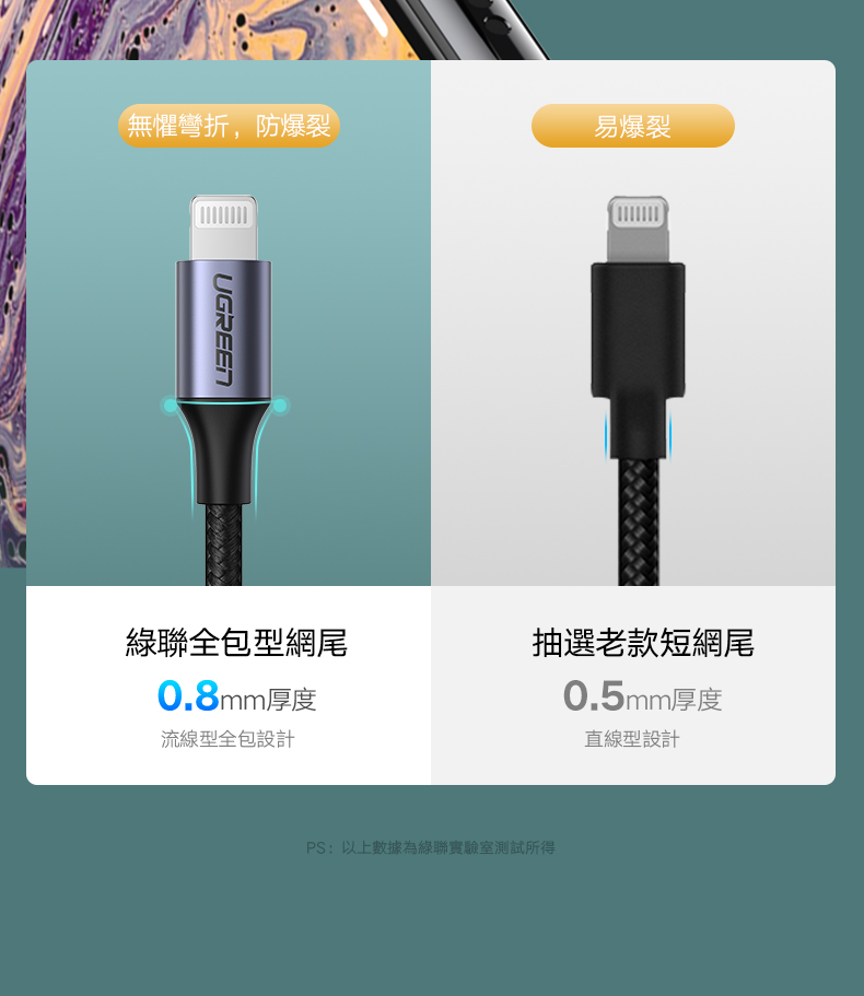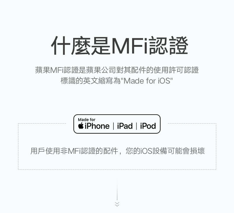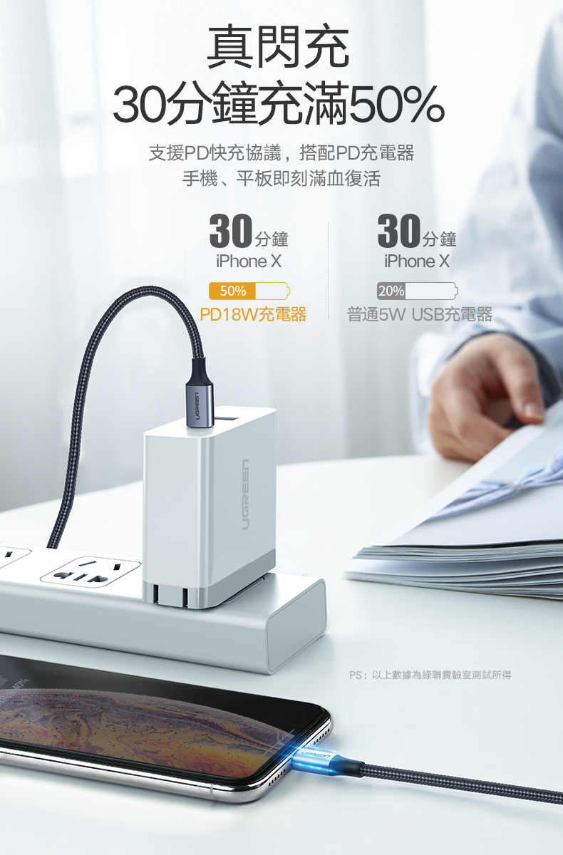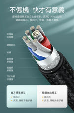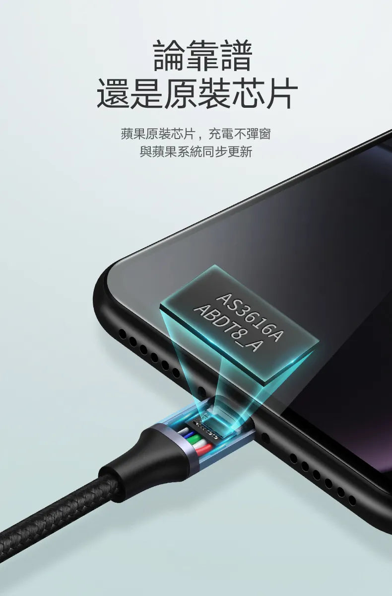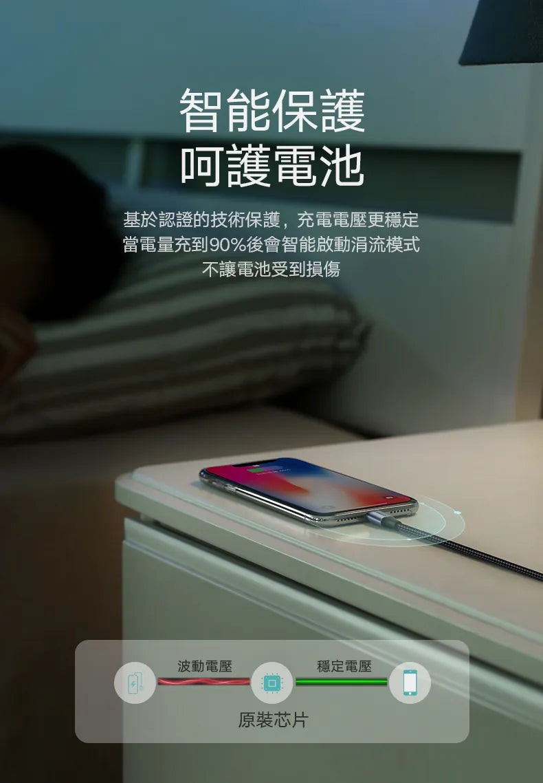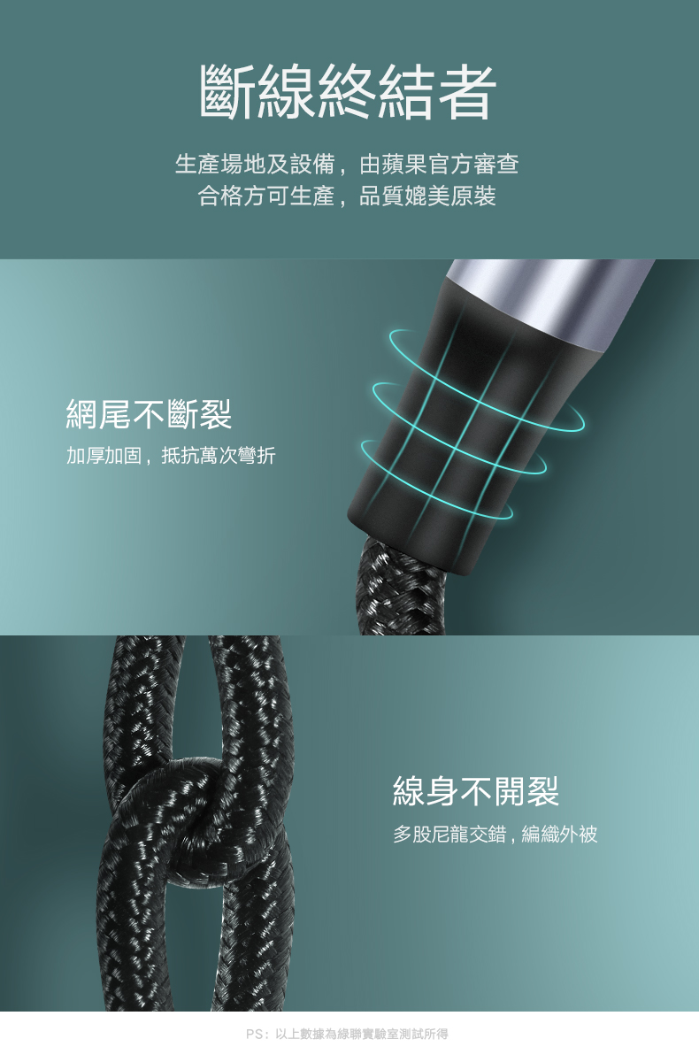 商品特色 ★ 真閃充30分鐘充滿50% ★蘋果官方認證 C94端子頭傳輸更穩定 ★ 網尾加厚加固,萬次彎折不斷裂 ★ 多股尼龍交錯編織,線身不開裂 ★ iOS系統全兼容不彈窗 ★ 充電傳輸兩不誤,智能保護呵護電池 ★ 21AWG加粗鍍錫銅線芯 ★ 鍍銠工藝抗氧化不生鏽