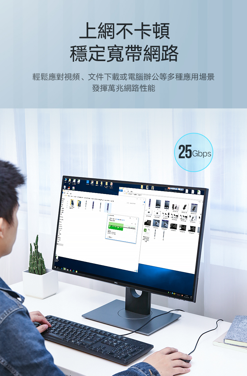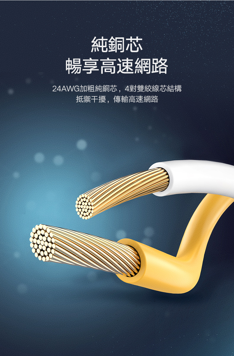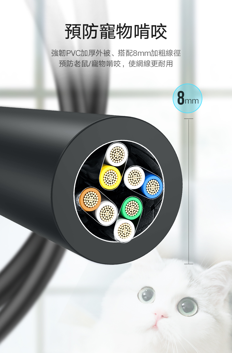商品特色 ★ 光速傳輸速率高達25Gbps ★ 24AWG加粗純銅芯暢享高速網路 ★ 雙層屏蔽守護網路暢通 ★ 上網不卡頓穩定寬帶網路 ★ 多種設備即插即用 ★ 加厚純銅鍍金端子抗氧化不生鏽 ★ 強韌PVC加厚外被預防寵物啃咬